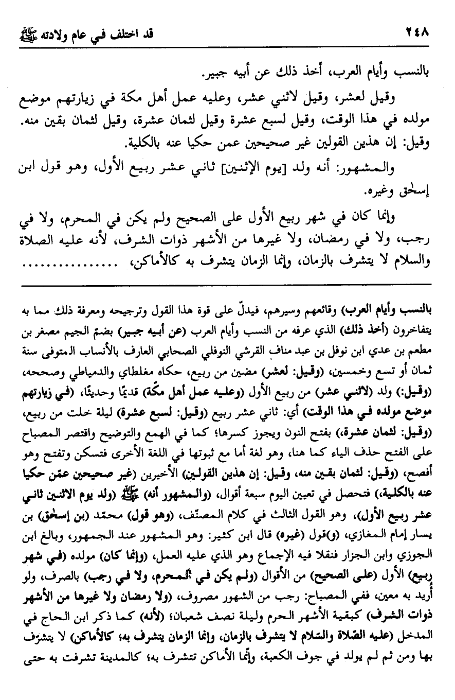 وقيل لعشر، وقيل لاثني عشر، وعليه عمل أهل مكة في زيارتهم موضع مولده في هذا الوقت، وقيل لسبع عشرة وقيل لثمان عشرة، وقيل لثمان بقين منه.