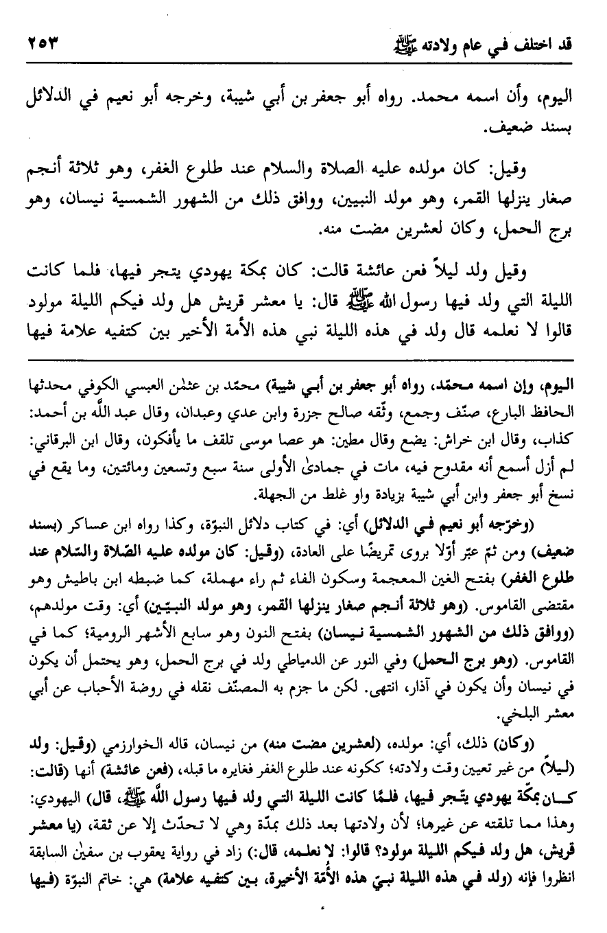 وقيل ولد ليلا فعن عائشة قالت: كان بمكة يهودي يتجر فيها، فلما كانت الليلة التي ولد فيها رسول الله صلى الله عليه وسلم قال: يا معشر قريش هل ولد فيكم الليلة مولود قالوا لا نعلمه قال ولد في هذه الليلة نبي هذه الأمة الأخير بين كتفيه علامة فيها