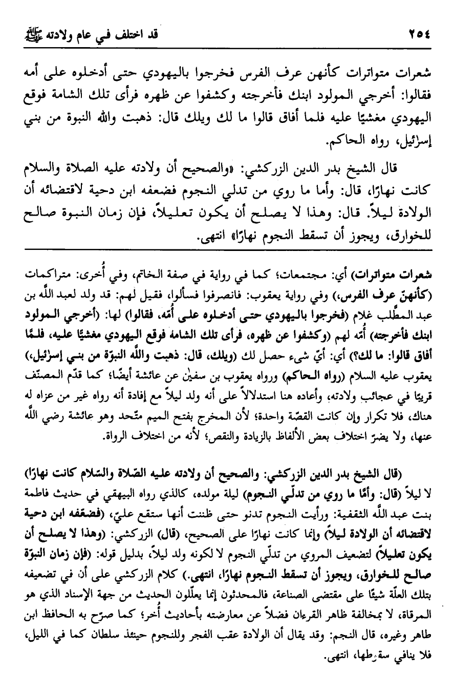 قال الشيخ بدر الدين الزركشي: "والصحيح أن ولادته عليه الصلاة والسلام كانت نهارًا، قال: وأما ما روي من تدلي النجوم فضعفه ابن دحية لاقتضائه أن الولادة ليلا. قال: وهذا لا يصح أن يكون تعليلا، فإن زمان النبوة صالح للخوارق، ويجوز أن تسقط النجوم نهارًا" انتهى.
