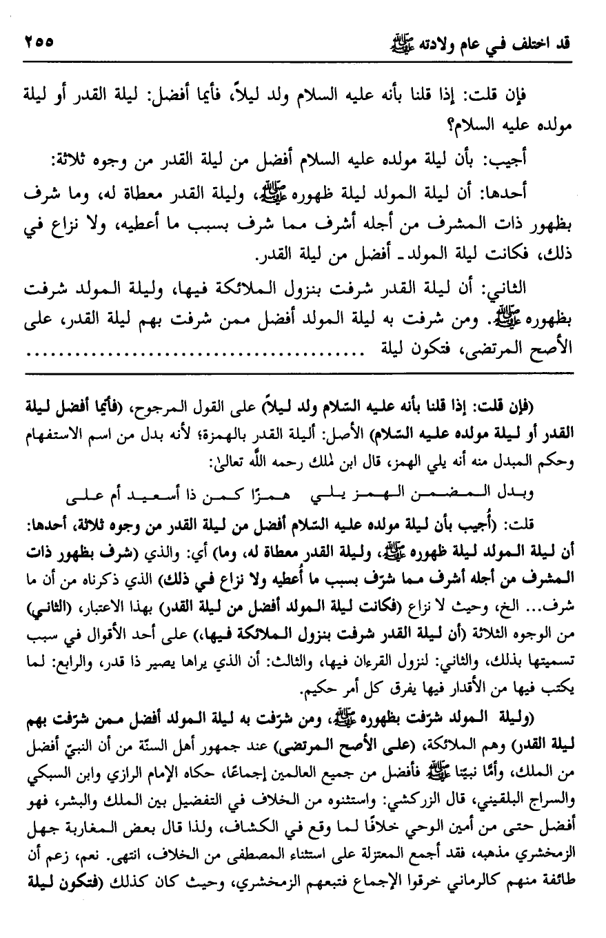 الثاني: أن ليلة القدر شرفت بنزول الملائكة فيها، وليلة المولد شرفت بظهوره صلى الله عليه وسلم. ومن شرفت به ليلة المولد أفضل ممن شرفت بهم ليلة القدر، على الأصح المرتضى، فتكون ليلة.......................