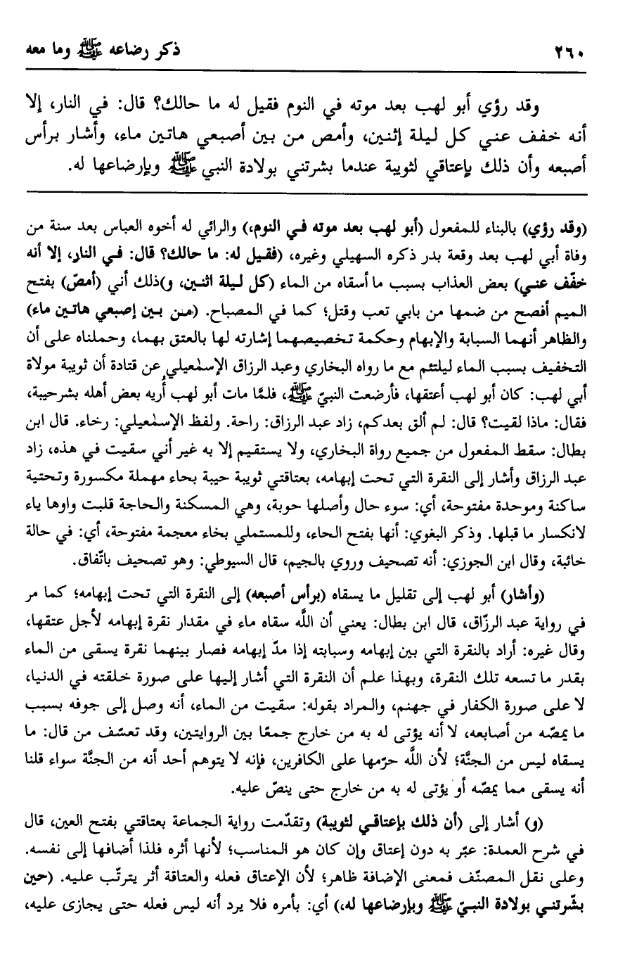 وقد رؤي أبو لهب بعد موته في النوم فقيل له ما حالك؟ قال: في النار، إلا أنه خفف عني كل ليلة اثنين، وأمص من بين أصبعي هاتين ماء، وأشار برأس أصبعه وأن ذلك بإعتاقي لثويبة عندما بشرتني بولادة النبي صلى الله عليه وسلم وبإرضاعها له.