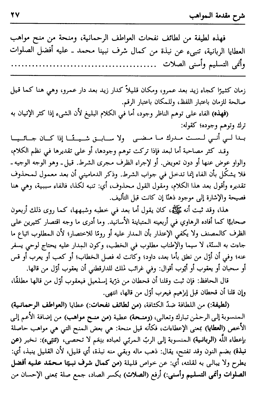 "لطيفة" من اللطافة ضد الكثافة، "من لطائف نفحات" عطايا "العواطف الرحمانية" المنسوبة إلى الرحمن تبارك وتعالى، "ومنحة" عطية "من منح مواهب" من إضافة الأعم إلى الأخص "العطايا" بمعنى الإعطاءات، فكأنه قيل منحة: هي بعض المنح التي هي مواهب حاصلة بإعطاء الله "الربانية" المنسوبة إلى الرب المربي لعباده بنعم لا تحصى، "تنبئ": تخبر "عن نبذة" بضم النون وقد تفتح، يقال: ذهب ماله وبقي منه نبذة، أي قليل، لأن القليل ينبذ, أي: يطرح ولا يبالي به لقلته، أي: عن خواص قليلة "من كمال شرف نبينا محمد عليه أفضل الصلوات وأنمى التسليم وأسنى" أرفع "الصلات" بكسر الصاد، جمع صلة بمعنى الإحسان من