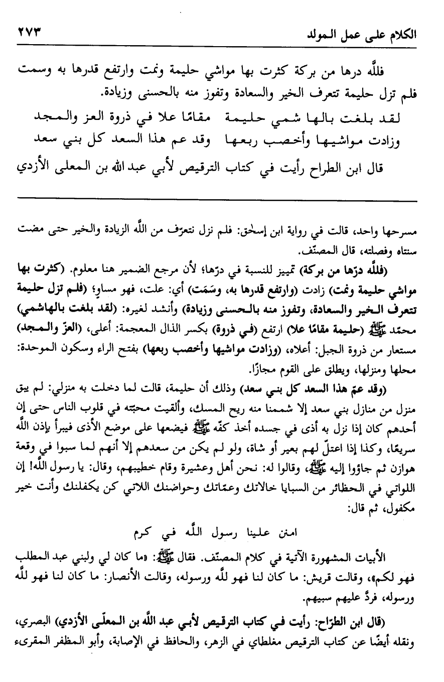 "فلله درها من بركة" تمييز للنسبة في درها؛ لأن مرجع الضمير هنا معلوم. "كثرت بها مواشي حليمة ونمت" زادت "وارتفع قدرها به، وسمت" أي: علت، فهو مساوٍ؛ "فلم تزل حليمة تتعرف الخير والسعادة، وتفوز منه بالحسنى وزيادة" وأنشد لغيره: "لقد بلغت بالهاشمي" محمد صلى الله عليه وسلم "حليمة مقامًا علا" ارتفع "في ذروة" بكسر الذال المعجمة: أعلى، "العز والمجد" مستعار من ذروة الجبل: أعلاه، "وزادت مواشيها وأخصب ربعها" بفتح الراء وسكون الموحدة: محلها ومنزلها، ويطلق على القوم مجازًا.