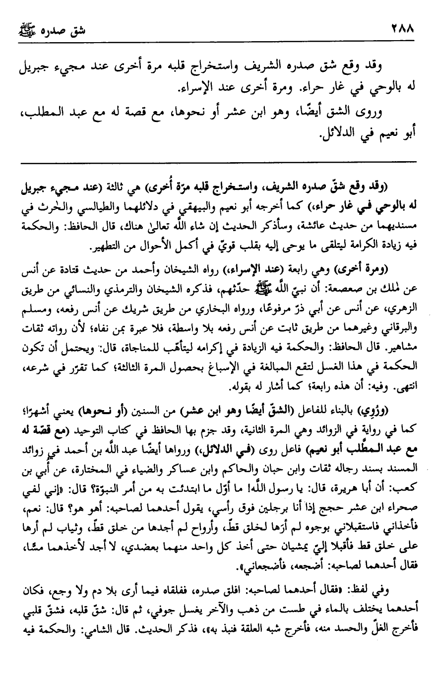 "وقد وقع شق صدره الشريف، واستخرج قلبه مرة أخرى" هي ثالثة "عند مجيء جبريل له بالوحي في غار حراء" كما أخرجه أبو نعيم والبيهقي في دلائلهما والطيالسي والحارث في مسنديهما من حديث عائشة، وسأذكر الحديث إن شاء الله تعالى هناك، قال الحافظ: والحكمة فيه زيادة الكرامة ليتلقى ما يوحى إليه بقلب قوي في أكمل الأحوال من التطهير.
