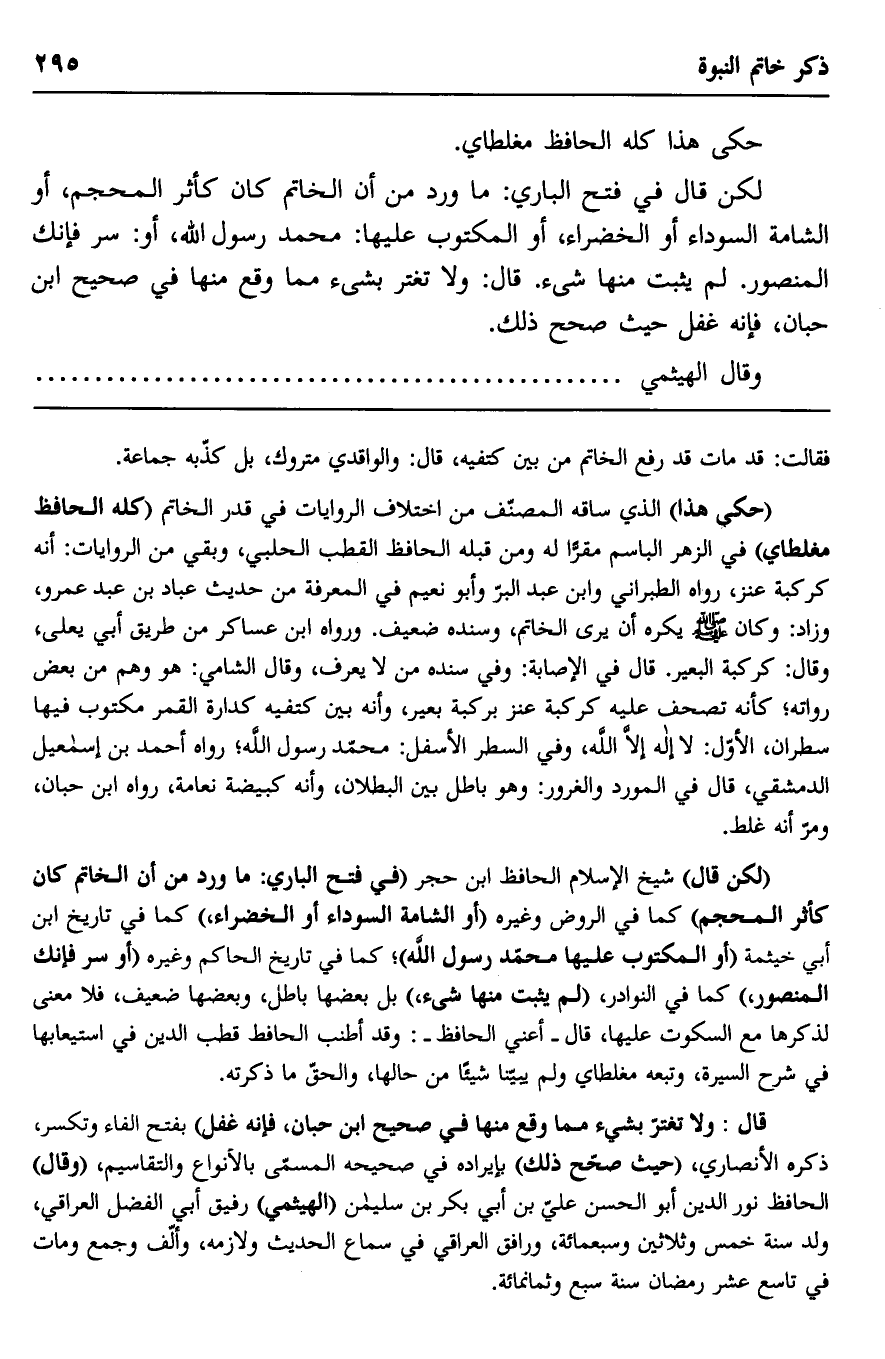 لكن قال في فتح الباري: ما ورد من أن الخاتم كان كأثر المحجم، أو الشامة السوداء أو الخضراء، أو المكتوب عليها: محمد رسول الله، أو: سر فإنك المنصور. لم يثبت منها شيء. قال: ولا تغتر بشيء مما وقع منها في صحيح ابن حبان، فإنه غفل حيث صحح ذلك.