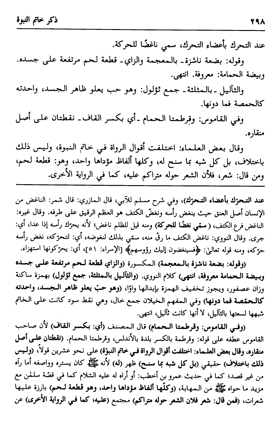 وقال بعض العلماء: اختلفت أقوال الرواة في خاتم النبوة، وليس ذلك باختلاف، بل كل شبه بما سنح له، وكلها ألفاظ مؤداها واحد، وهو: قطعة لحم، ومن قال: شعر، فلأن الشعر حوله متراكم عليه، كما في الرواية الأخرى.