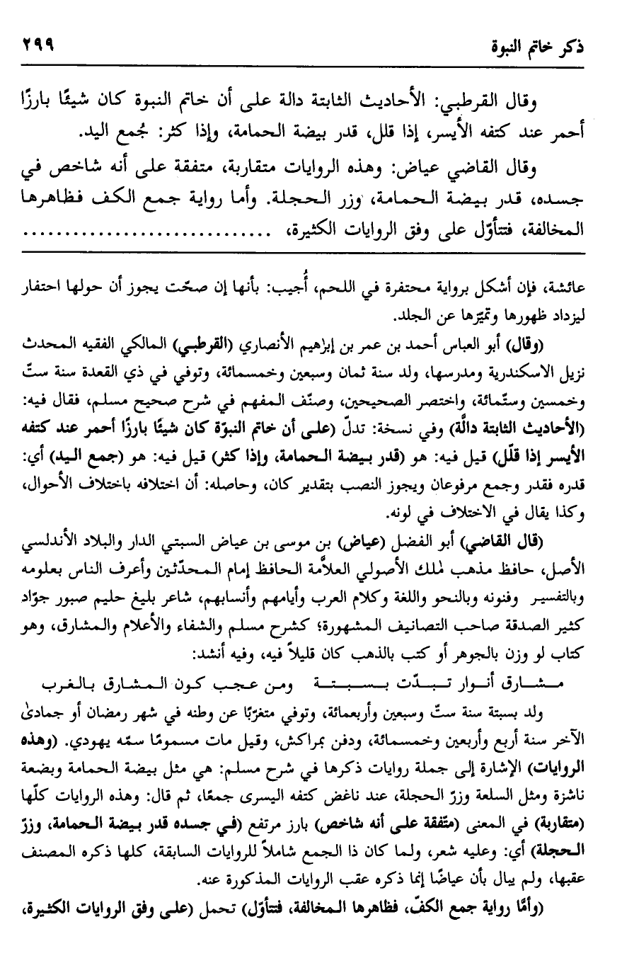 وقال القرطبي: الأحاديث الثابتة دالة على أن خاتم النبوة كان شيئًا بارزًا أحمر عند كتفه الأيسر، إذا قلل، قدر بيضة الحمامة، وإذا كثر: جمع اليد.