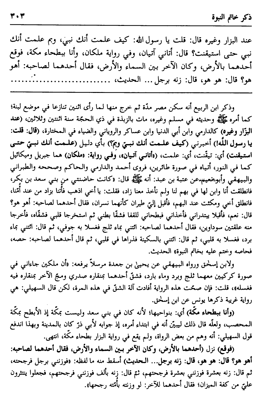 عند البزار وغيره قال: قلت يا رسول الله: كيف علمت أنك نبي، وبم علمت أنك نبي حتى استيقنت؟ قال: $"أتاني آتيان، وفي رواية ملكان، وأنا ببطحاء مكة، فوقع أحدهما بالأرض، وكان الآخر بين السماء والأرض، فقال أحدهما لصاحبه: أهو هو؟ قال: هو هو، قال: زنه برجل" ... الحديث............................