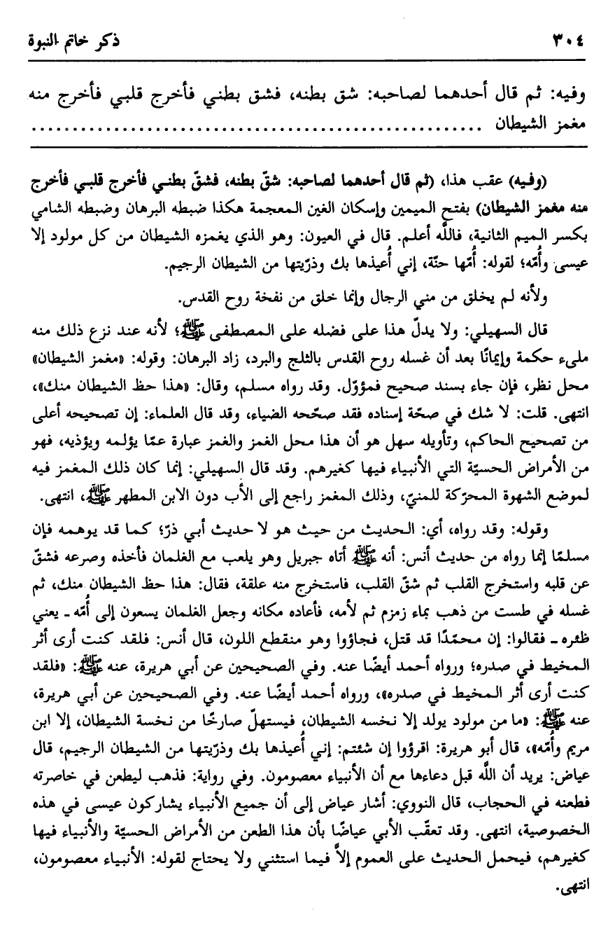 قال السهيلي: ولا يدل هذا على فضله على المصطفى صلى الله عليه وسلم؛ لأنه عند نزع ذلك منه ملئ حكمة وإيمانا بعد أن غسله روح القدس بالثلج والبرد، زاد البرهان: وقوله: "مغمز الشيطان" محل نظر، فإن جاء بسند صحيح فمؤول. وقد رواه مسلم، وقال: "هذا حظ الشيطان منك" انتهى. قلت: لا شك في صحة إسناده فقد صححه الضياء، وقد قال العلماء: إن تصحيحه أعلى من تصحيح الحاكم، وتأويله سهل هو أن هذا محل الغمز والغمز عبارة عما يؤلمه ويؤذيه، فهو من الأمراض الحسية التي الأنبياء فيها كغيرهم. وقد قال السهيلي: إنما كان ذلك المغمز فيه لموضع الشهوة المحركة للمني، وذلك المغمز راجع إلى الأب دون الابن المطهر صلى الله عليه وسلم، انتهى.