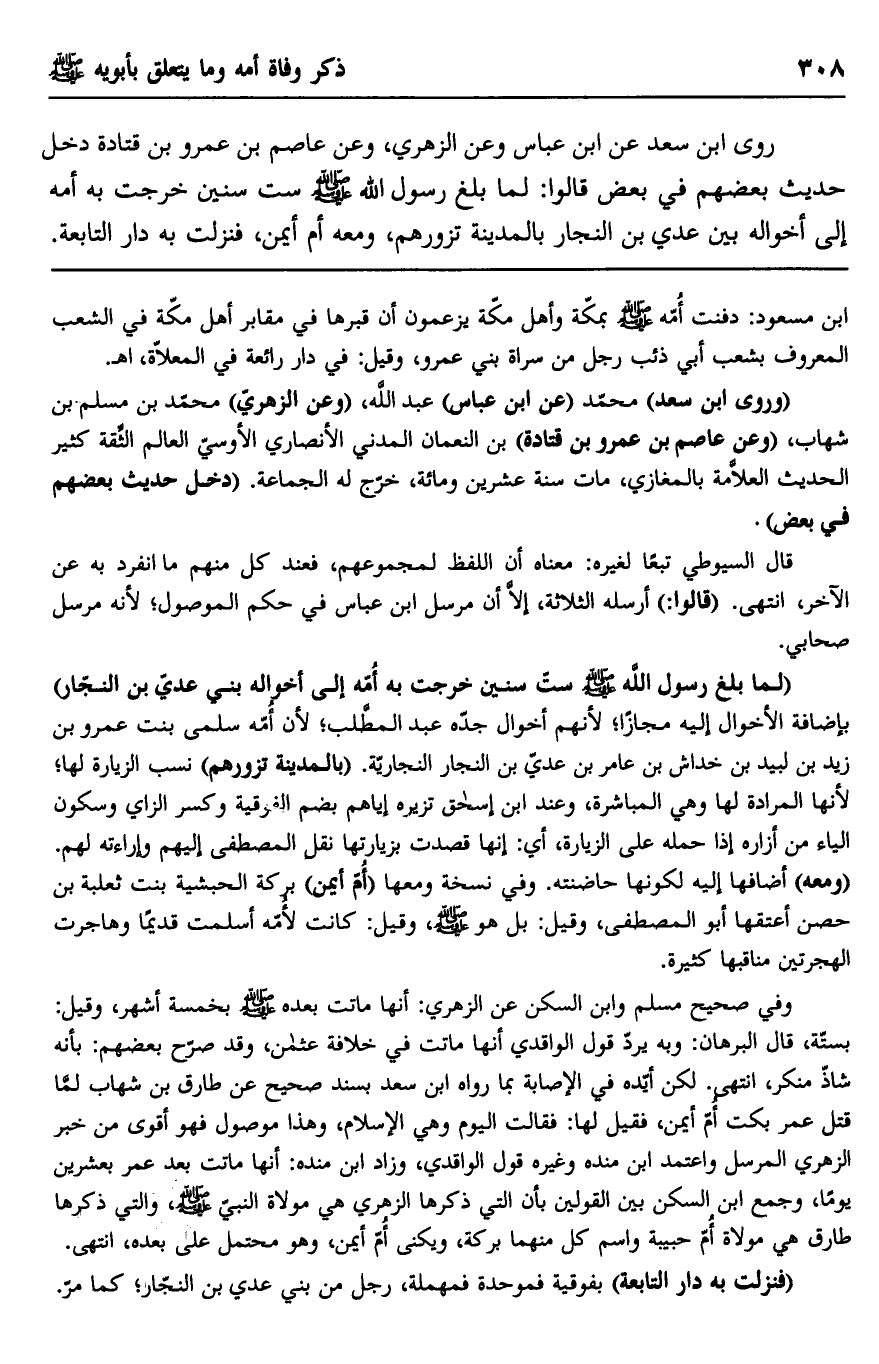روى ابن سعد عن ابن عباس وعن الزهري، وعن عاصم بن عمرو بن قتادة دخل حديث بعضهم في بعض قالوا: لما بلغ رسول الله صلى الله عليه وسلم ست سنين خرجت به أمه إلى أخواله بني عدي بن النجار بالمدينة تزورهم، ومعه أم أيمن، فنزلت به دار التابعة.