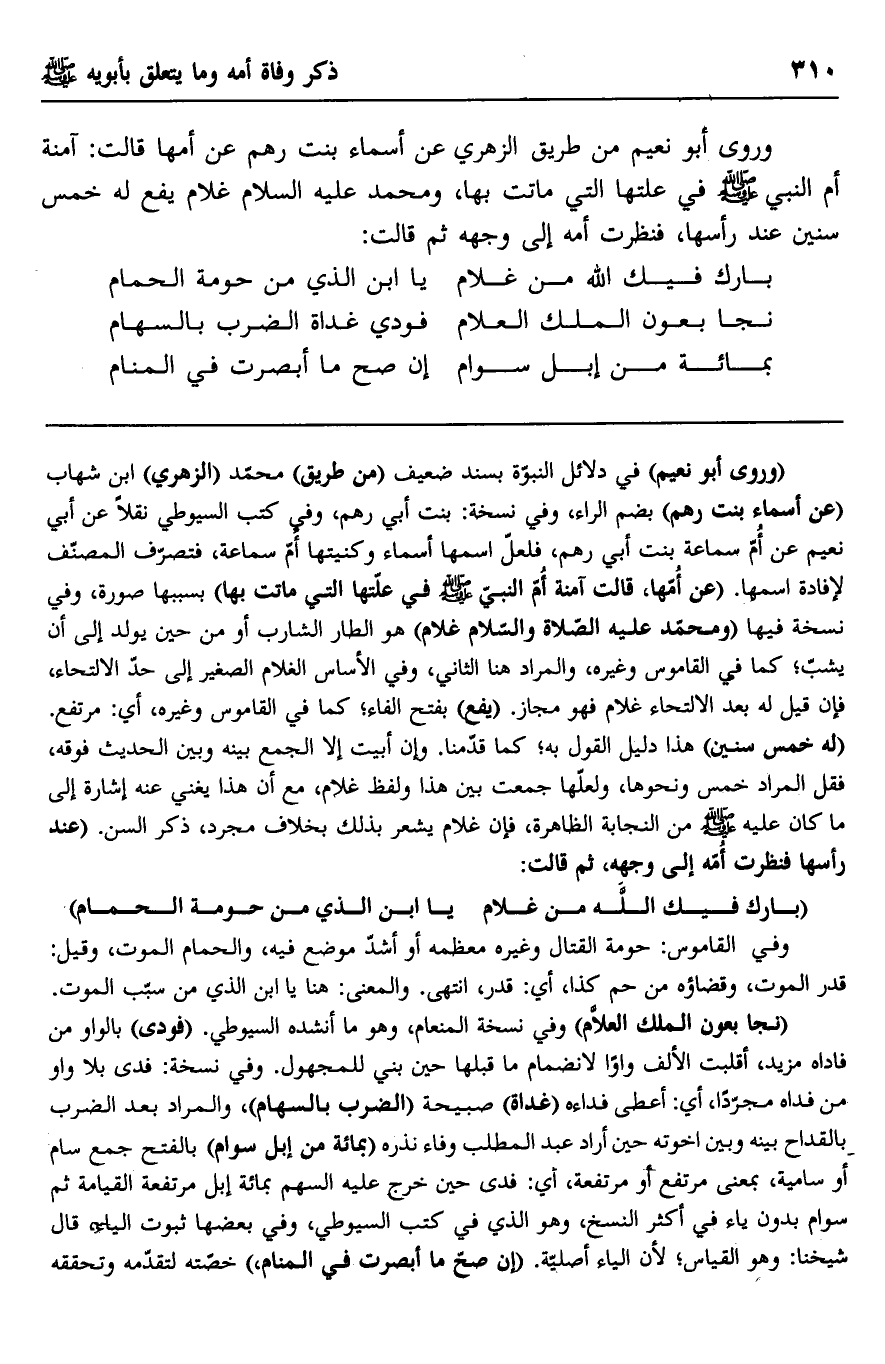 "نجا بعون الملك العلام" وفي نسخة المنعام، وهو ما أنشده السيوطي. "فودي" بالواو من فاداه مزيد، أقلبت الألف واوًا لانضمام ما قبلها حين بني للمجهول. وفي نسخة: فدى بلا واو من فداه مجردًا، أي: أعطى فداءه "غداة" صبيحة "الضرب بالسهام" والمراد بعد الضرب بالقداح بينه وبين إخوته حين أراد عبد المطلب وفاء نذره "بمائة من إبل سوام" بالفتح جمع سام أو سامية، بمعنى مرتفع أو مرتفعة، أي: فدي حين خرج عليه السهم بمائة إبل مرتفعة القيامة ثم سوام بدون ياء في أكثر النسخ، وهو الذي في كتب السيوطي، وفي بعضها ثبوت الياء، قال شيخنا: وهو القياس؛ لأن الياء أصلية. "إن صح ما أبصرت في المنام" خصته لتقدمه وتحققه