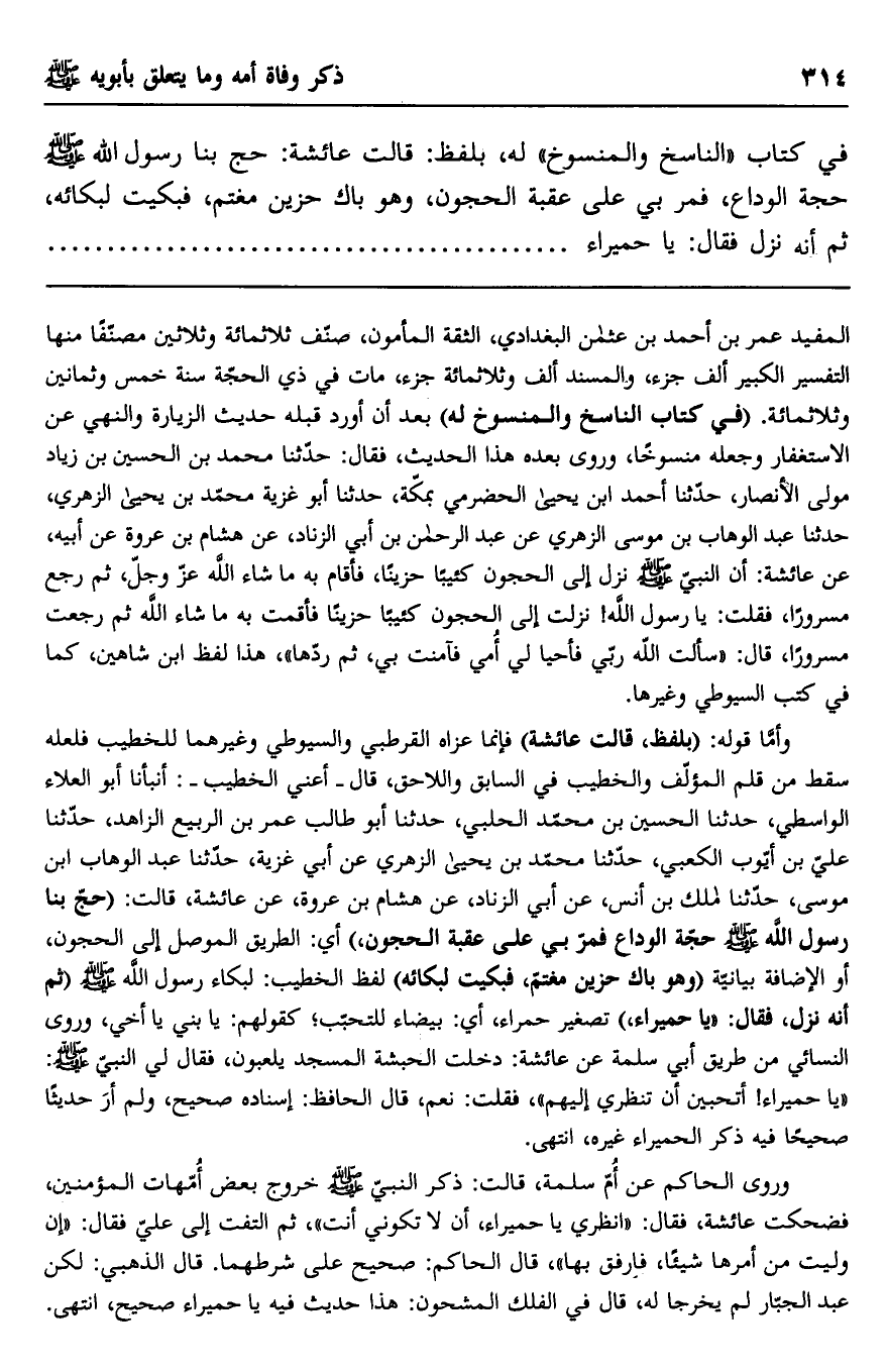 المفيد عمر بن أحمد بن عثمان البغدادي، الثقة المأمون، صنف ثلاثمائة وثلاثين مصنفًا منها التفسير الكبير ألف جزء، والمسند ألف وثلاثمائة جزء، مات في ذي الحجة سنة خمس وثمانين وثلاثمائة. "في كتاب الناسخ والمنسوخ له" بعد أن أورد قبله حديث الزيارة والنهي عن الاستغفار وجعله منسوخًا، وروى بعده هذا الحديث، فقال: حدثنا محمد بن الحسين بن زياد مولى الأنصار، حدثنا أحمد بن يحيى الحضرمي بمكة، حدثنا أبو غزية محمد بن يحيى الزهري، حدثنا عبد الوهاب بن موسى الزهري عن عبد الرحمن بن أبي الزناد، عن هشام بن عروة عن أبيه، عن عائشة: أن النبي صلى الله عليه وسلم نزل إلى الحجون كئيبًا حزينًا، فأقام به ما شاء الله عز وجل، ثم رجع مسرورًا، فقلت: يا رسول الله! نزلت إلى الحجون كئيبًا حزينًا فأقمت به ما شاء الله ثم رجعت مسرورًا، قال: "سألت الله ربي فأحيا لي أمي فآمنت بي، ثم ردها". هذا لفظ ابن شاهين، كما في كتب السيوطي وغيرها.
