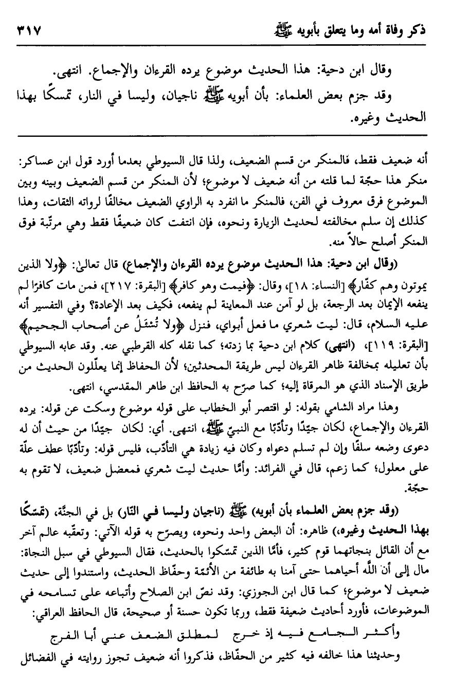 "وقال ابن دحية: هذا الحديث موضوع يرده القرآن والإجماع" قال تعالى: {وَلَا الَّذِينَ يَمُوتُونَ وَهُمْ كُفَّارٌ} [النساء: 18] ، وقال: {فَيَمُتْ وَهُوَ كَافِرٌ} [البقرة: 217] ، فمن مات كافرا لم ينفعه الإيمان بعد الرجعة، بل لو آمن عند المعاينة لم ينفعه، فكيف بعد الإعادة؟ وفي التفسير أنه عليه السلام، قال: "ليت شعري ما فعل أبواي"، فنزل: {وَلَا تُسْأَلُ عَنْ أَصْحَابِ الْجَحِيمِ} [البقرة: 119] ، "انتهى" كلام ابن دحية بما زدته؛ كما نقله كله القرطبي عنه. وقد عابه السيوطي بأن تعليله بمخالفة ظاهر القرآن ليس طريق المحدثين؛ لأن الحفاظ إنما يعللون الحديث من طريق الإسناد الذي هو المرقاة إليه؛ كما صرح به الحافظ ابن طاهر المقدسي، انتهى.