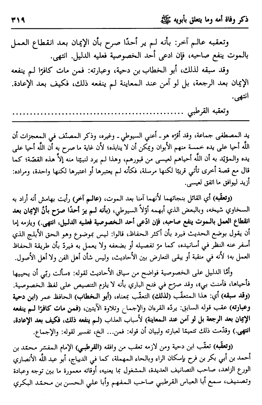 وأما الدليل على الخصوصية فواضح من سياق الأحاديث لقوله: "سألت ربي أن يحييها فأحياها، فآمنت بي"، وقد صرح في فتح الباري بأنه لا يلزم التنصيص على لفظ الخصوصية. "وقد سبقه" أي: هذا المتعقب "لذلك" التعقب بمعناه، "أبو الخطاب الحافظ عمر "ابن دحية وعبارته" عقب قوله السابق: يرده القرآن والإجماع وتلاوة الآيتين، "فمن مات كافرًا لم ينفعه الإيمان بعد الرجعة بل لو آمن عند المعاينة" لأسباب العذاب "لم ينفعه ذلك، فكيف بعد الإعادة انتهى" وقدمت ذلك تتميمًا لعبارته ولبيان أن قوله: فمن ... إلخ، تفسير لقوله: والإجماع.