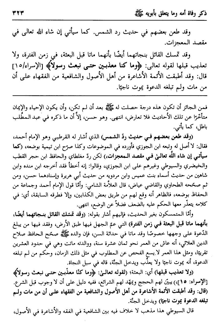 وقد تمسك القائل بنجاتهما أيضًا بأنهما ماتا قبل البعثة، في زمن الفترة، ولا تعذيب قبلها لقوله تعالى: {وَمَا كُنَّا مُعَذِّبِينَ حَتَّى نَبْعَثَ رَسُولًا} [الإسراء: 15] قال: وقد أطبقت الأئمة الأشاعرة من أهل الأصول والشافعية من الفقهاء على أن من مات ولم تبلغه الدعوة يموت ناجيًا.