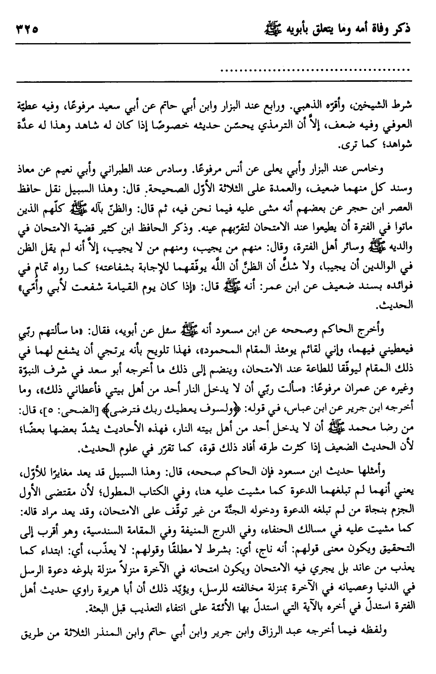 وخامس عند البزار وأبي يعلى عن أنس مرفوعًا. وسادس عند الطبراني وأبي نعيم عن معاذ وسند كل منهما ضعيف، والعمدة على الثلاثة الأول الصحيحة. قال: وهذا السبيل نقل حافظ العصر ابن حجر عن بعضهم أنه مشى عليه فيما نحن فيه، ثم قال: والظن بآله صلى الله عليه وسلم كلهم الذين ماتوا في الفترة أن يطيعوا عند الامتحان لتقربهم عينه. وذكر الحافظ ابن كثير قضية الامتحان في والديه صلى الله عليه وسلم وسائر أهل الفترة، وقال: منهم من يجيب، ومنهم من لا يجيب، إلا أنه لم يقل الظن في الوالدين أن يجيبا، ولا شك أن الظن أن الله يوفقهما للإجابة بشفاعته؛ كما رواه تمام في فوائده بسند ضعيف عن ابن عمر: أنه صلى الله عليه وسلم قال: "إذا كان يوم القيامة شفعت لأبي وأمي" الحديث.