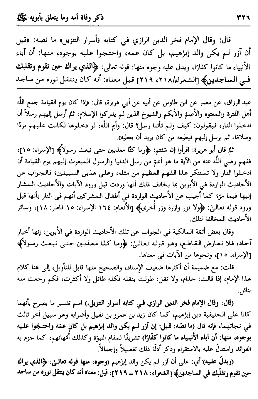 "قال: وقال الإمام فخر الدين الرازي في كتابه أسرار التنزيل" اسم تفسير ما يصرح بأنهما كانا على الحنيفية دين إبراهيم، كما كان زيد بن عمرو بن نفيل وأضرابه وهو سبيل آخر ثالث في نجاتهما، فإنه قال "ما نصه: قيل: إن آزر لم يكن والد إبراهيم بل كان عمه واحتجوا عليه بوجوه، منها: أن آباء الأنبياء ما كانوا كفارًا" تشريفًا لمقام النبوة وكذلك أمهاتهم، كما جزم به الفوائد واستدل عليه بالاستقراء وذكر أدلة ذلك تفصيلا وإجمالا.