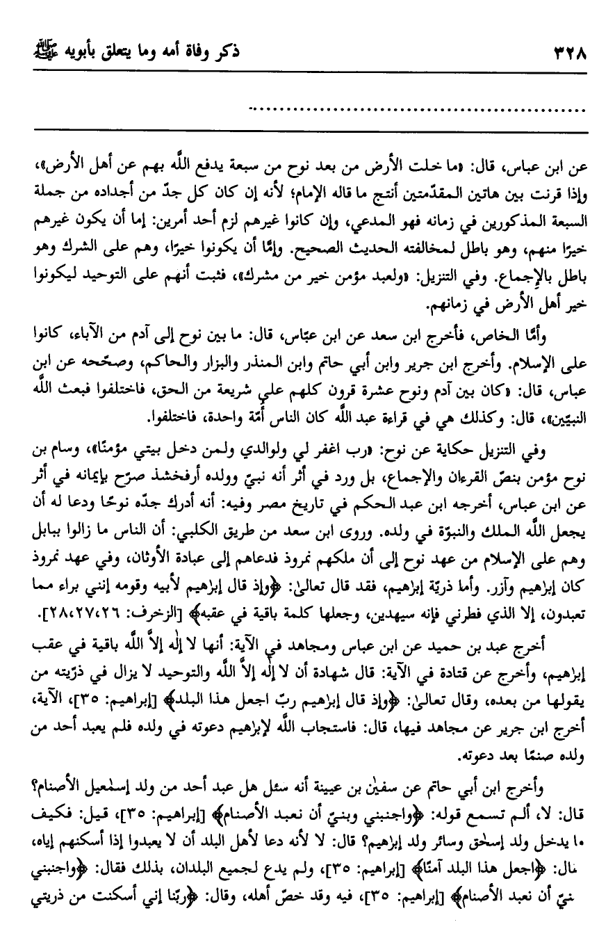 وفي التنزيل حكاية عن نوح: {رَبِّ اغْفِرْ لِي وَلِوَالِدَيَّ وَلِمَنْ دَخَلَ بَيْتِيَ مُؤْمِنًا} وسام بن نوح مؤمن بنص القرآن والإجماع، بل ورد في أثر أنه نبي وولده أرفخشذ صرح بإيمانه في أثر عن ابن عباس، أخرجه ابن عبد الحكم في تاريخ مصر وفيه: أنه أدرك جده نوحًا ودعا له أن يجعل الله الملك والنبوة في ولده. وروى ابن سعد من طريق الكلبي: أن الناس ما زالوا ببابل وهم على الإسلام من عهد نوح إلى أن ملكهم نمروذ فدعاهم إلى عبادة الأوثان، وفي عهد نمروذ كان إبراهيم وآزر, وأما ذرية إبراهيم، فقد قال تعالى: {وَإِذْ قَالَ إِبْرَاهِيمُ لِأَبِيهِ وَقَوْمِهِ إِنَّنِي بَرَاءٌ مِمَّا تَعْبُدُونَ، إِلَّا الَّذِي فَطَرَنِي فَإِنَّهُ سَيَهْدِينِ، وَجَعَلَهَا كَلِمَةً بَاقِيَةً فِي عَقِبِهِ} [الزخرف: 26، 27، 28] .