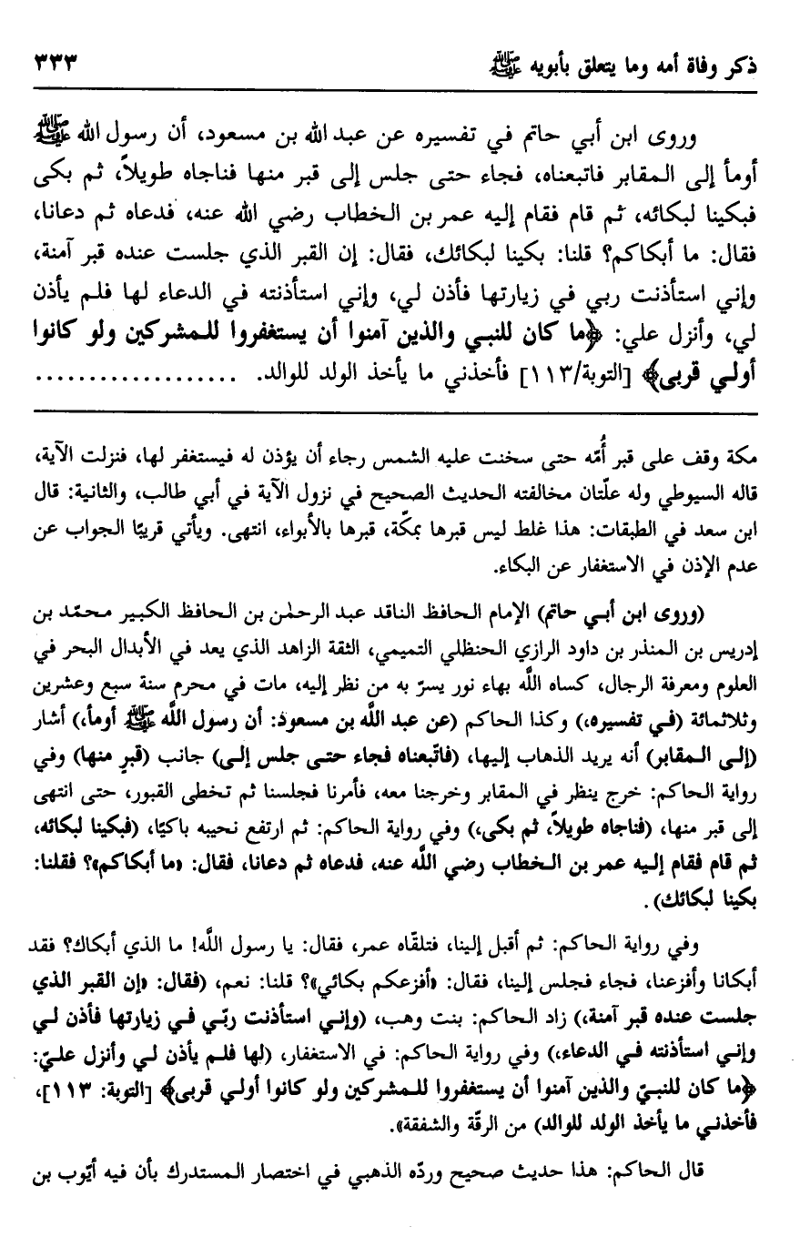 وروى ابن أبي حاتم في تفسيره عن عبد الله بن مسعود، أن رسول الله صلى الله عليه وسلم أومأ إلى المقابر فاتبعناه، فجاء حتى جلس إلى قبر منها فناجاه طويلا، ثم بكى فبكينا لبكائه، ثم قام فقام إليه عمر بن الخطاب رضي الله عنه، فدعاه ثم دعانا، فقال: ما أبكاكم؟ قلنا: بكينا لبكائك، فقال: إن القبر الذي جلست عنده قبر آمنة، وإني استأذنت ربي في زيارتها فأذن لي، وإني استأذنته في الدعاء لها فلم يأذن لي، وأنزل عليّ: {مَا كَانَ لِلنَّبِيِّ وَالَّذِينَ آمَنُوا أَنْ يَسْتَغْفِرُوا لِلْمُشْرِكِينَ وَلَوْ كَانُوا أُولِي قُرْبَى} [التوبة: 113] فأخذني ما يأخذ الولد للوالد.........................