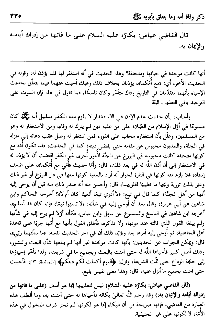 "قال القاضي عياض: بكاؤه عليه السلام" ليس لتعذيبها إنما هو أسف "على ما فاتها من إدراك أيامه والإيمان به" وقد رحم الله تعالى بكاءه فأحياها له حتى آمنت به، وما ألطف هذه العبارة من القاضي، فإنها صريحة في أن البكاء إنما هو لكونها لم تحز شرف الدخول في هذه الأمة، لا لكونها على غير الحنيفية.