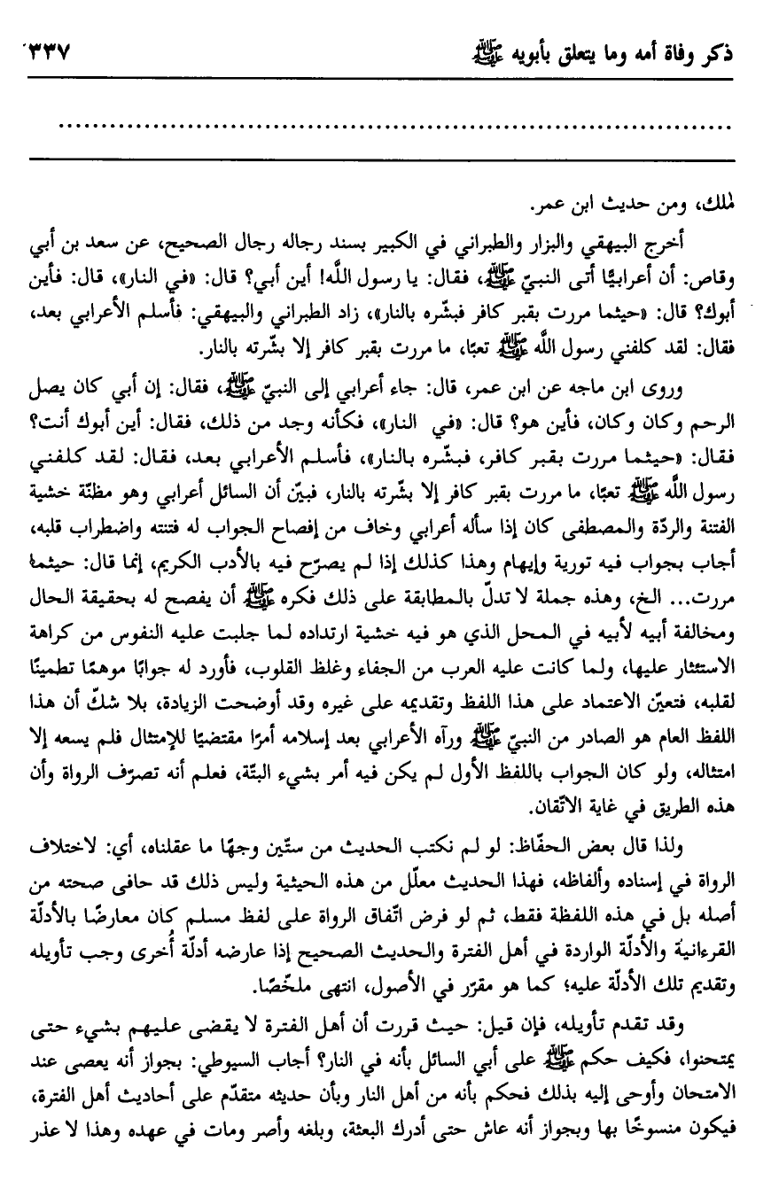 وروى ابن ماجه عن ابن عمر، قال: جاء أعرابي إلى النبي صلى الله عليه وسلم فقال: إن أبي كان يصل الرحم وكان وكان، فأين هو؟ قال: "في النار" فكأنه وجد من ذلك، فقال: أين أبوك أنت؟ فقال: "حيثما مررت بقبر كافر، فبشره بالنار" فأسلم الأعرابي بعد، فقال: لقد كلفني رسول الله صلى الله عليه وسلم تعبًا، ما مررت بقبر كافر إلا بشرته بالنار، فبين أن السائل أعرابي وهو مظنة خشية الفتنة والردة والمصطفى كان إذا سأله أعرابي وخاف من إفصاح الجواب له فتنته واضطراب قلبه، أجاب بجواب فيه تورية وإيهام وهذا كذلك إذا لم يصرح فيه بالأدب الكريم، إنما قال: حيثما مررت ... إلخ، وهذه جملة لا تدل بالمطابقة على ذلك فكره صلى الله عليه وسلم أن يفصح له بحقيقة الحال ومخالفة أبيه لأبيه في المحل الذي هو فيه خشية ارتداده لما جلبت عليه النفوس من كراهة الاستئثار عليها، ولما كانت عليه العرب من الجفاء وغلظ القلوب، فأورد له جوابًا موهمًا تطمينًا لقلبه، فتعين الاعتماد على هذا اللفظ وتقديمه على غيره وقد أوضحت الزيادة، بلا شك أن هذا اللفظ العام هو الصادر من النبي صلى الله عليه وسلم ورآه الأعرابي بعد إسلامه أمرًا مقتضيًا للامتثال فلم يسعه إلا امتثاله، ولو كان الجواب باللفظ الأول لم يكن فيه أمر بشيء البتة، فعلم أنه تصرف الرواة وأن هذه الطريق في غاية الإتقان.