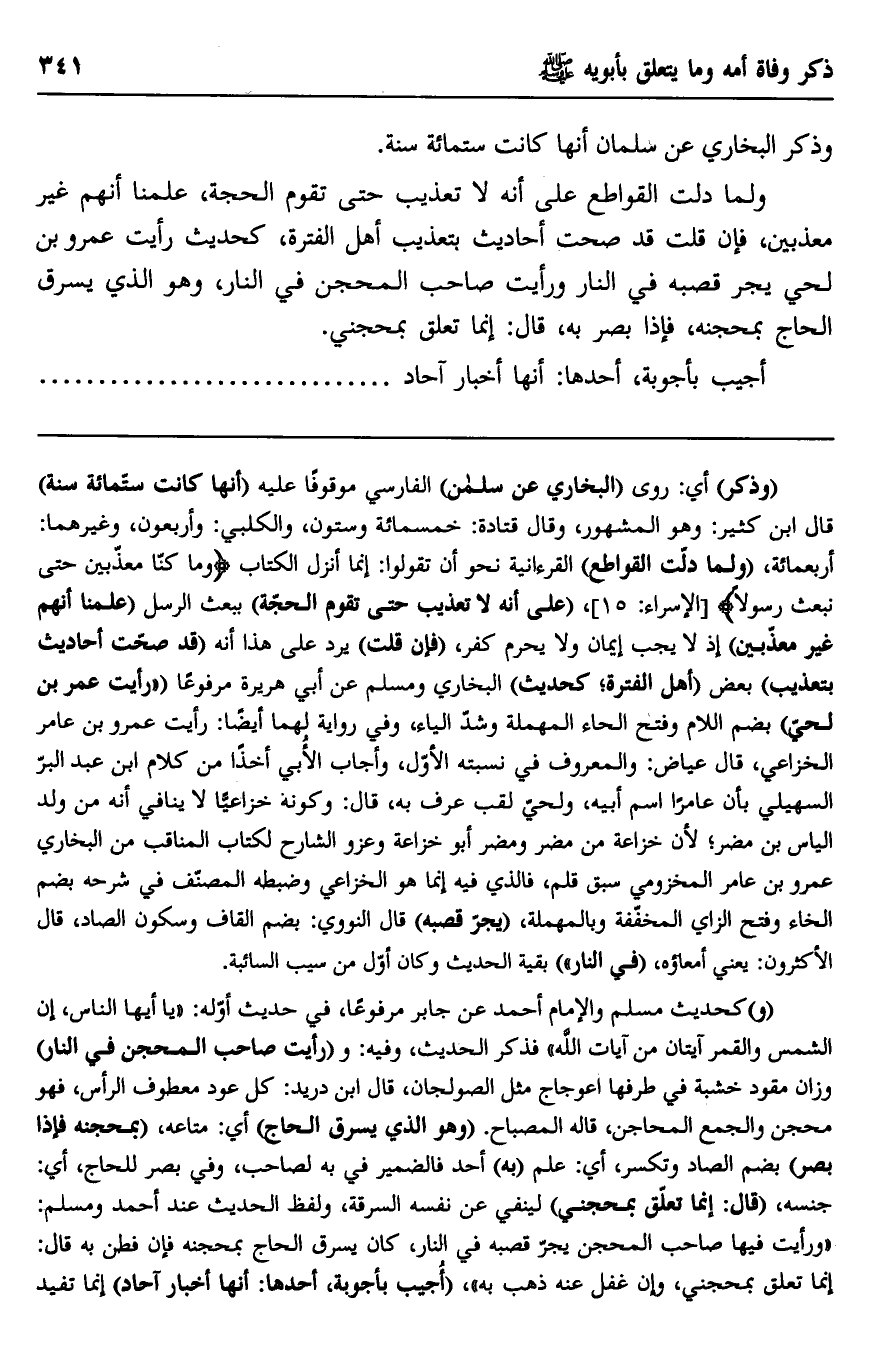 ولما دلت القواطع على أنه لا تعذيب حتى تقوم الحجة، علمنا أنهم غير معذبين، فإن قلت قد صحت أحاديث بتعذيب أهل الفترة، كحديث: "رأيت عمرو بن لحي يجر قصبه في النار ورأيت صاحب المحجن في النار"، وهو الذي يسرق الحاج بمحجنه، فإذا بصر به، قال: إنما تعلق بمحجني.