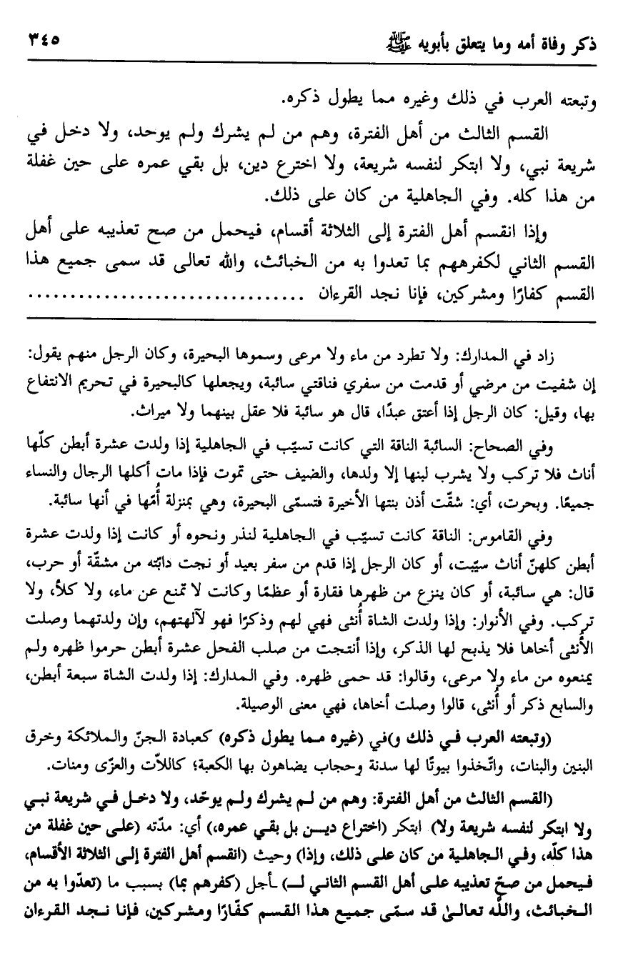 وفي القاموس: الناقة كانت تسيب في الجاهلية لنذر ونحوه أو كانت إذا ولدت عشرة أبطن كلهن أناث سيبت، أو كان الرجل إذا قدم من سفر بعيد أو نجت دابته من مشقة أو حرب، قال: هي سائبة، أو كان ينزع من ظهرها فقارة أو عظما وكانت لا تمنع عن ماء، ولا كلأ، ولا تركب. وفي الأنوار: وإذا ولدت الشاة أنثى فهي لهم وذكرًا فهو لآلهتهم، وإن ولدتهما وصلت الأنثى أخاها فلا يذبح لها الذكر، وإذا أنتجت من صلب الفحل عشرة أبطن حرموا ظهره ولم يمنعوه من ماء ولا مرعى، وقالوا: قد حمى ظهره. وفي المدارك: إذا ولدت الشاة سبعة أبطن، والسابع ذكر أو أنثى، قالوا وصلت أخاها، فهي معنى الوصيلة.