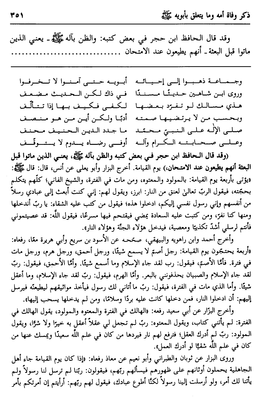 "وقد قال الحافظ ابن حجر في بعض كتبه والظن بآله صلى الله عليه وسلم، يعني الذين ماتوا قبل البعثة أنهم يطيعون عند الامتحان" يوم القيامة. أخرج البزار وأبو يعلى عن أنس، قال: قال صلى الله عليه وسلم: "يؤتى بأربعة يوم القيامة: بالمولود والمعتوه، ومن مات في الفترة، والشيخ الفاني؛ كلهم يتكلم بحجته، فيقول الرب تعالى لعنق من النار: ابرز، ويقول لهم: إني كنت أبعث إلى عبادي رسلا من أنفسهم وإني رسول نفسي إليكم، ادخلوا هذه؛ فيقول من كتب عليه الشقاء: يا رب أندخلها ومنها كنا نفر؟ ومن كتبت عليه السعادة يمضي فيقتحم فيها مسرعًا، فيقول الله: قد عصيتموني فأنتم لرسلي أشد تكذيبًا ومعصية، فيدخل، هؤلاء الجنة وهؤلاء النار".