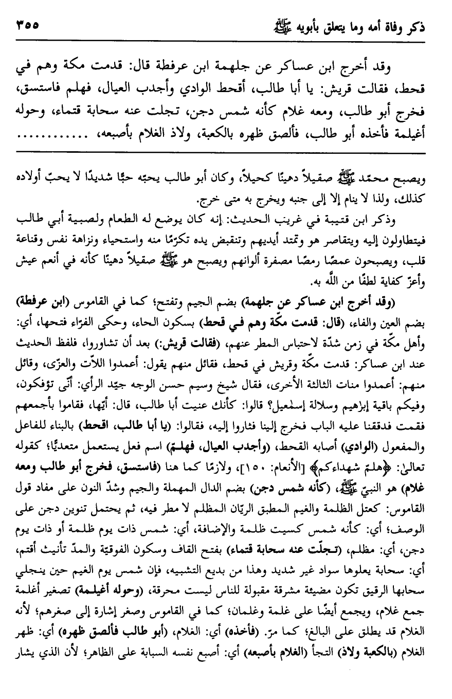 وذكر ابن قتيبة في غريب الحديث: أنه كان يوضع له الطعام ولصبية أبي طالب فيتطاولون إليه ويتقاصر هو وتمتد أيديهم وتنقبض يده تكرمًا منه واستحياء ونزاهة نفس وقناعة قلب، ويصبحون عمصًا رمصًا مصفرة ألوانهم ويصبح هو صلى الله عليه وسلم صقيلا دهينًا كأنه في أنعم عيش وأعز كفاية لطفًا من الله به.