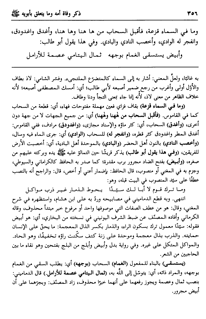 "يستسقى" بالبناء للمفعول "الغمام" السحاب "بوجهه" أي: يطلب السقي من الغمام بوجهه، والمراد ذاته، أي: يتوسل إلى الله به، "ثمال اليتامى عصمة للأرامل" قال الدماميني: بنصب ثمال وعصمة ويجوز رفعهما على أنهما خبر محذوف، زاد المصنف: وبجرهما على أن أبيض مجرور.