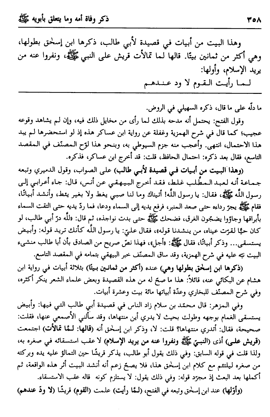 وفي المزهر: قال محمد بن سلام زاد الناس في قصيدة أبي طالب التي فيها: وأبيض يستقي الغمام بوجهه وطولت بحيث لا يدري أين منتهاها، وقد سألني الأصمعي عنها، فقلت: صحيحة، فقال: أتدري منتهاها؟ قلت: لا، وذكر ابن إسحاق أنه "قالها: لما تمالأت" اجتمعت "قريش على" أذى "النبي صلى الله عليه وسلم ونفروا عنه من يريد الإسلام" لا عقب استسقائه في صغره به، ولذا قلت في قوله السابق: وفي ذلك يقول أبو طالب، يذكر قريشًا حين التمالؤ عليه يده وبركته من صغره ليلتئم مع كلام ابن إسحاق هذا، فلا يصح زعم أنه أنشد البيت أثر هذه الواقعة، ثم أكملها بعد البعث إذ مجرد قوله: وفي ذلك يقول: لا يستلزم كونه قال عقب الاستسقاء.