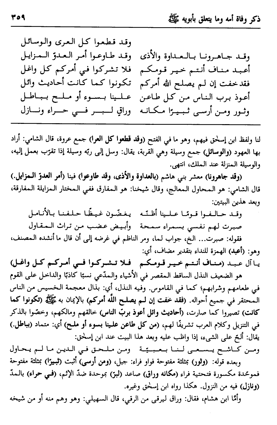 لنا ولفظ ابن إسحاق فيهم، وهو ما في الفتح "وقد قطعوا كل العرا" جمع عروة، قال الشامي: أراد بها العهود "والوسائل" جمع وسيلة وهي القربة، يقال: وسل إلى ربه وسيلة إذا تقرب بعمل إليه، والوسيلة المنزلة عند الملك، انتهى.