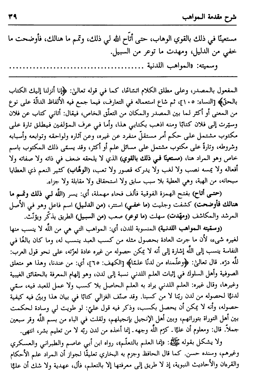 "وسميته المواهب اللدنية" المنسوبة للدن، أي: المواهب التي هي من الله لا ينسب منها لغيره شيء لأن ما جرت العادة بحصول مثله من كسب العبد ينسب له، وما كان بالغًا في النفاسة ينسب إلى الله إشارة إلى أنه لا يمكن حصوله من غيره عادة لعزته، على نحو قول العرب لله دره. قال تعالى: {وَعَلَّمْنَاهُ مِنْ لَدُنَّا عِلْمًا} [الكهف: 65] ، أي: من عندنا، وهذا هو متعلق الصوفية وأهل السلوك في إثبات العلم اللدني نسبة إلى لدن، وهو إلهام المعرفة بالحقائق الغيبية وغيرها، وقال غيره: العلم اللدني يراد به العلم الحاصل بلا كسب ولا عمل للعبد فيه، سمي لدنيًا لحصوله من لدن ربنا لا من كسبنا. وقد صنف الغزالي كتابًا في بيان هذا وبين فيه كيفية حصوله، وأنه لا يمكن أن يحصل بكسب، وذكر فيه قول علي: لو طويت لي وسادة لحكمت بين أهل التوراة بتوراتهم، وبين أهل الإنجيل بإنجيلهم، ولقلت في الباء من بسم الله وقر سبعين جملا. قال: ومعلوم أن عليًا -كرم الله وجهه- إنما أخذه من لدن ربه لا من تعليم بشر، انتهى.