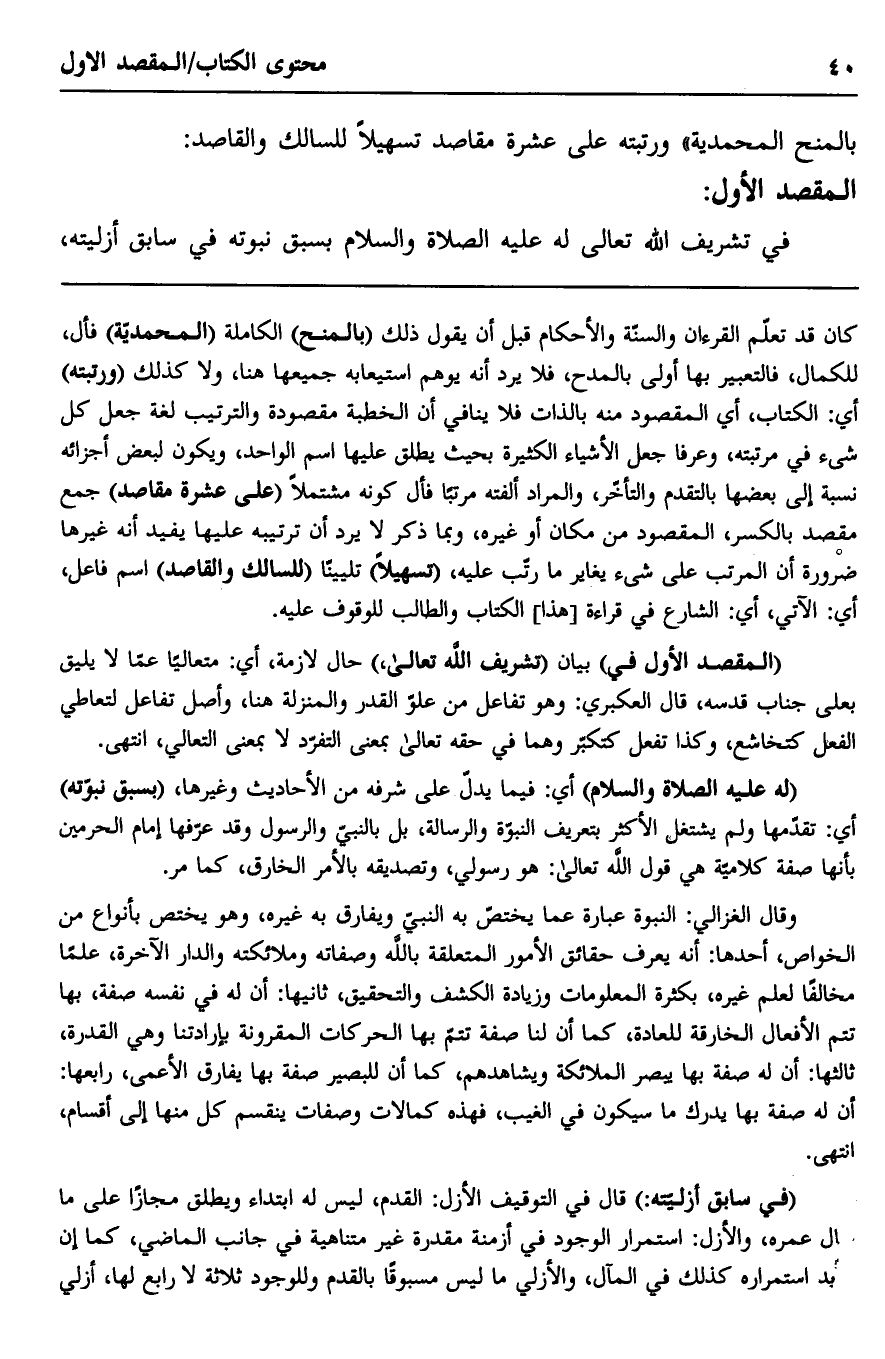 كان قد تعلم القرآن والسنة والأحكام قبل أن يقول ذلك "بالمنح" الكاملة "المحمدية" فأل، للكمال، فالتعبير بها أولى بالمدح، فلا يرد أنه يوهم استيعابه جميعها هنا، ولا كذلك "ورتبته" أي: الكتاب، أي المقصود منه بالذات فلا ينافي أن الخطبة مقصودة والترتيب لغة جعل كل شيء في مرتبته، وعرفا جعل الأشياء الكثيرة بحيث يطلق عليها اسم الواحد، ويكون لبعض أجزائه نسبة إلى بعضها بالتقدم والتآخر، والمراد ألفته مرتبا فأل كونه مشتملا "على عشرة مقاصد" جمع مقصد بالكسر، المقصود من مكان أو غيره، وبما ذكر لا يرد أن ترتيبه عليها يفيد أنه غيرها ضرورة أن المرتب على شيء يغاير ما رتب عليه، "تهسيلا" تليينًا "للسالك والقاصد" اسم فاعل، أي: الآتي، أي: الشارع في قراءة "هذا" الكتاب والطالب للوقوف عليه.
