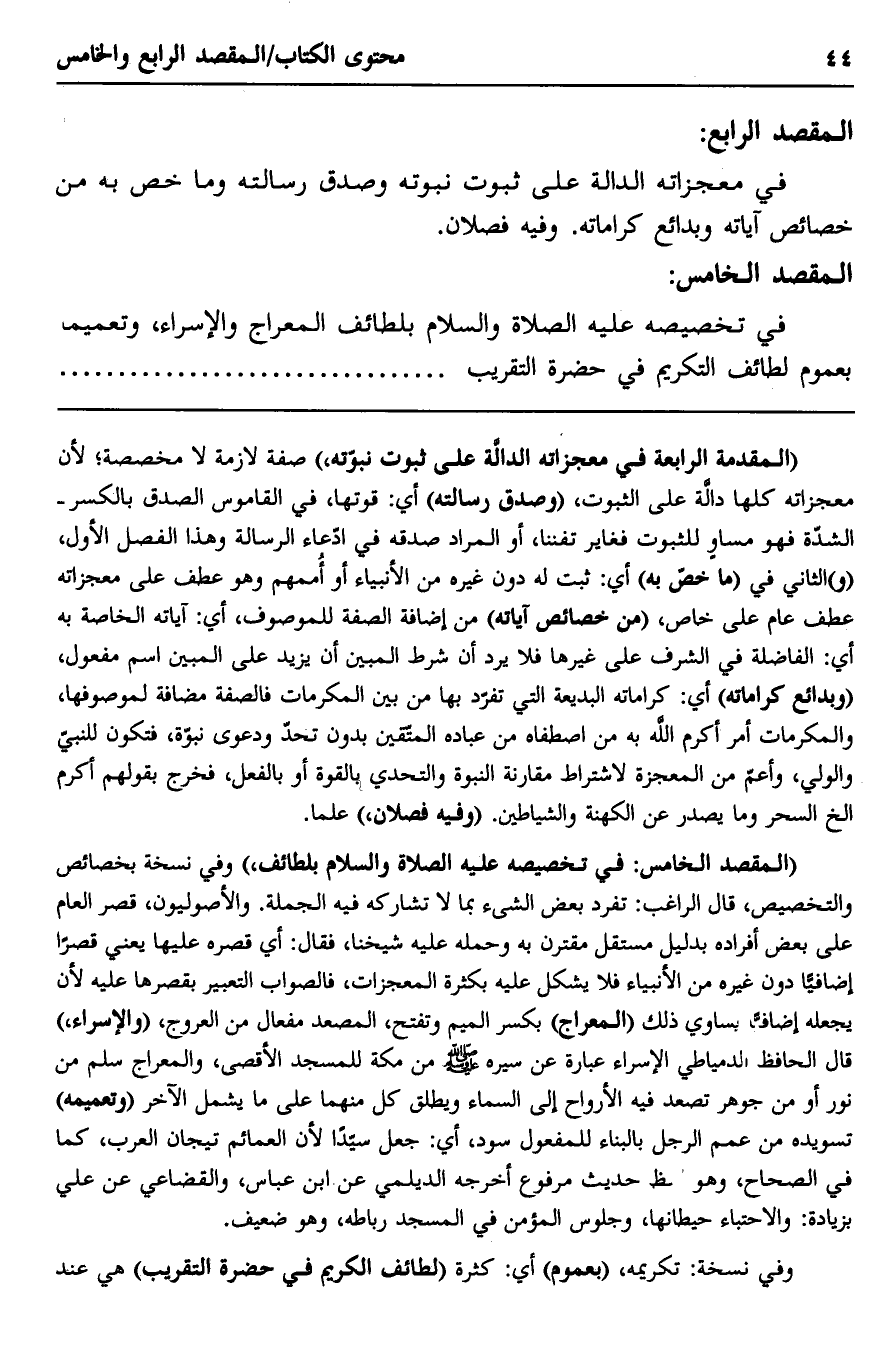 "المقصد الخامس: في تخصيصه عليه الصلاة والسلام بلطائف" وفي نسخة بخصائص والتخصيص، قال الراغب: تفرد بعض الشيء بما لا تشاركه فيه الجملة. والأصوليون، قصر العام على بعض أفراده بدليل مستقل مقترن به وحمله عليه شيخنا، فقال: أي قصره عليها يعني قصرًا إضافيًا دون غيره من الأنبياء فلا يشكل عليه بكثرة المعجزات، فالصواب التعبير بقصرها عليه لأن يجعله إضافيا يساوي ذلك "المعراج" بكسر الميم وتفتح، المصعد مفعال من العروج، "والإسراء" قال الحافظ الدمياطي الإسراء عبارة عن سيرة النبي صلى الله عليه وسلم من مكة للمسجد الأقصى، والمعراج سلم من نور أو من جوهر تصعد فيه الأرواح إلى السماء ويطلق كل منهما على ما يشمل الآخر "ونعيمه" تسويده من عمم الرجل بالبناء للمفعول سود، أي: جعل سيدًا لأن العمائم تيجان العرب، كما في الصحاح، وهو لفظ حديث مرفوع أخرجه الديلمي عن ابن عباس، والقضاعي عن علي بزيادة: والاحتباء حيطانها، وجلوس المؤمن في المسجد رباطه، وهو ضعيف.