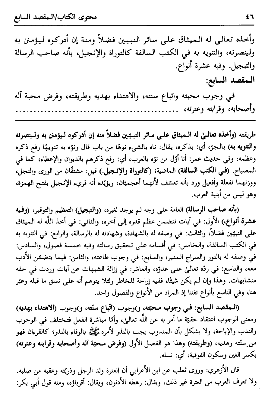"المقصد السابع: في وجوب محبته, و" وجوب اتباع سنته, و" وجوب "الاهتداء بهديه" ومعنى الوجوب اعتقاد حقية ما أمر به عن الله تعالى، وأما مباشرة الفعل فتختلف في الوجوب والندب والإباحة، ولا يشكل بأن المندوب يجب بالنذر لأمره صلى الله عليه وسلم بالوفاء بالنذر، كالقرآن فهو من سنته وهديه، "وطريقته" وهذا هو الفصل الأول "وفرض محبة آله وأصحابه وقرابته وعترته" بكسر العين وسكون الفوقية، أي: نسله.