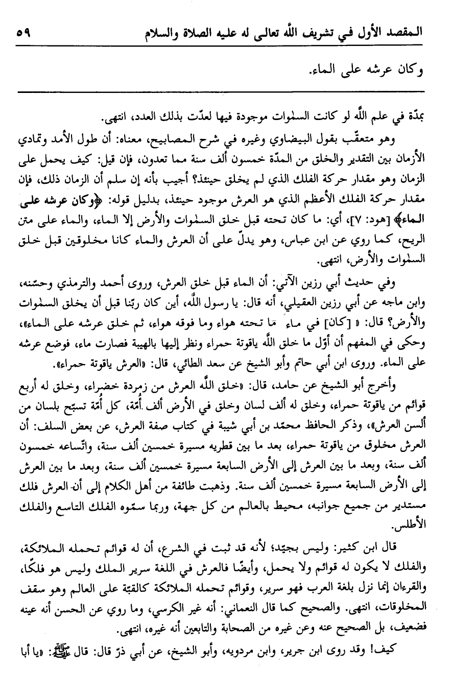 وفي حديث أبي رزين الآتي: أن الماء قبل خلق العرش، وروى أحمد والترمذي وحسنه، وابن ماجه عن أبي رزين العقيلي، أنه قال: يا رسول الله، أين كان ربنا قبل أن يخلق السماوات والأرض؟ قال: ""كان" في ماء ما تحته هواء وما فوقه هواء، ثم خلق عرشه على الماء". وحكى في الفهم أن أول ما خلق الله ياقوتة حمراء ونظر إليها بالهيبة فصارت ماء، فوضع عرشه على الماء، وروى ابن أبي حاتم وأبو الشيخ عن سعد الطائي، قال: "العرش ياقوتة حمراء".