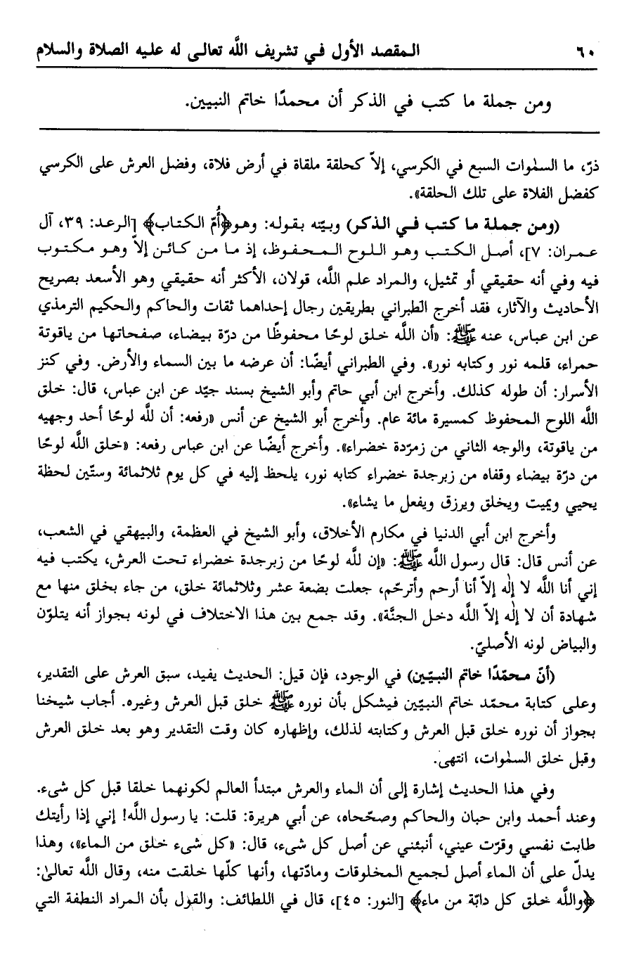 "ومن جملة ما كتب في الذكر" وبينه بقوله: وهو {أُمُّ الْكِتَابِ} [الرعد: 39، آل عمران: 7] ، أصل الكتب وهو اللوح المحفوظ، إذ ما من كائن إلا وهو مكتوب فيه وفي أنه حقيقي أو تمثيل، والمراد علم الله، قولان، الأكثر أنه حقيقي وهو الأسعد بصريح الأحاديث والآثار، فقد أخرج الطبراني بطريقين رجال إحداهما ثقات والحاكم والحكيم الترمذي عن ابن عباس، عنه صلى الله عليه وسلم: "أن الله خلق لوحًا محفوظا من درة بيضاء، صفحاتها من ياقوتة حمراء، قلمه نور وكتابه نور". وفي الطبراني أيضًا: أن عرشه ما بين السماء والأرض. وفي كنز الأسرار: أن طوله كذلك. وأخرج ابن أبي حاتم وأبو الشيخ بسند جيد عن ابن عباس، قال: خلق الله اللوح المحفوظ كمسيرة مائة عام, وأخرج أبو الشيخ عن أنس رفعه: "أن لله لوحًا أحد وجهيه ياقوتة، والوجه الثاني من زمردة خضراء". وأخرج أيضًا عن ابن عباس رفعه: "خلق الله لوحًا من ندرة بيضاء وقفاه من زبرجدة خضراء كتابه نور، يلحظ إليه في كل يوم ثلاثمائة وستين لحظة يحيي ويميت ويخلق ويرزق ويفعل ما يشاء".