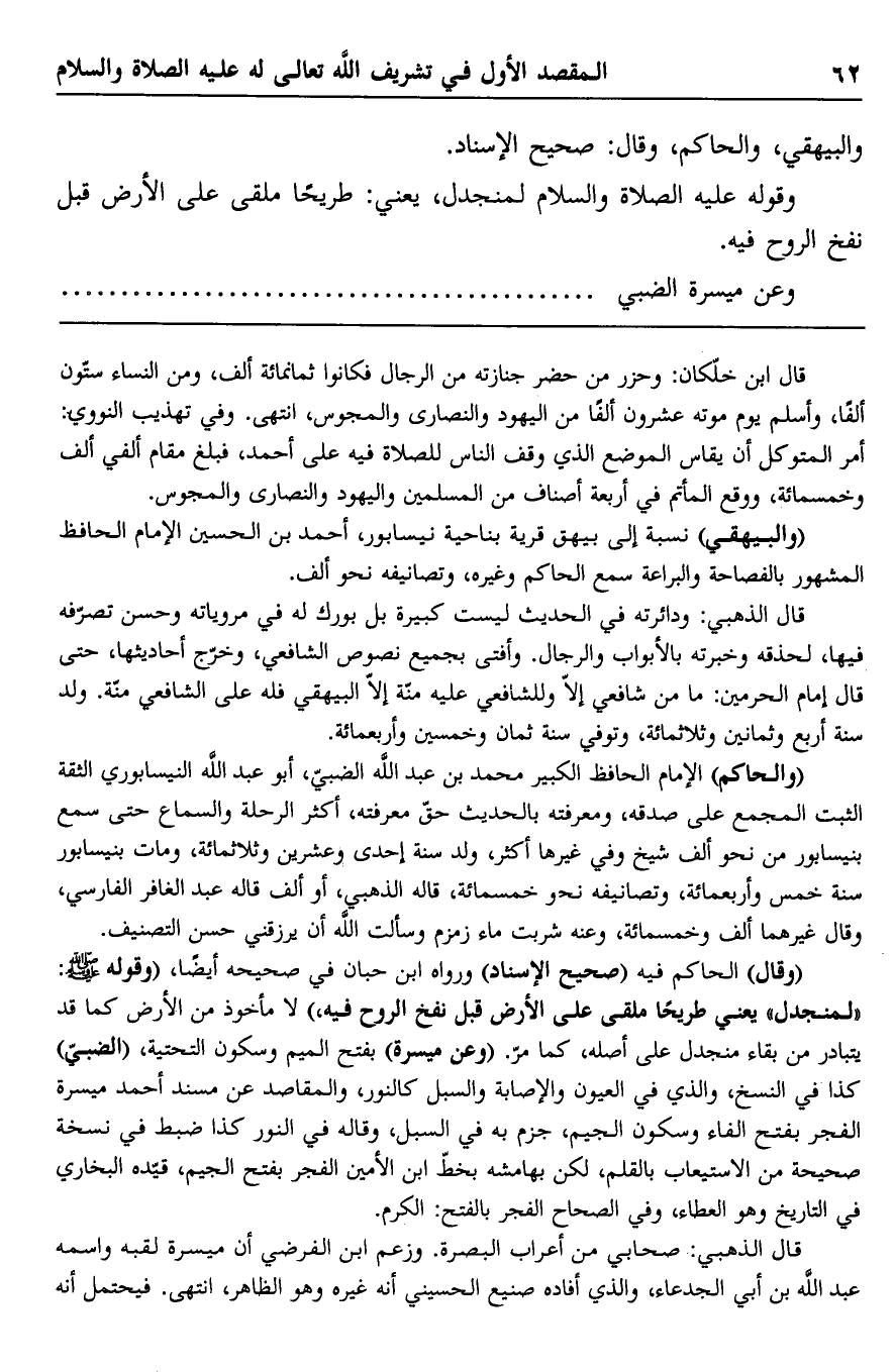 "وقال" الحاكم فيه "صحيح الإسناد" ورواه ابن حبان في صحيحه أيضًا، "وقوله صلى الله عليه وسلم: "لمنجدل" يعني طريحًا ملقى على الأرض قبل نفخ الروح فيه" لا مأخوذ من الأرض كما قد بادر من بقاء منجدل على أصله، كما مر. "وعن ميسرة" بفتح الميم وسكون التحتية، "الضبي" كذا في النسخ، والذي في العيون والإصابة والسبل كالنور، والمقاصد عن مسند أحمد ميسرة الفجر بفتح الفاء وسكون الجيم، جزم به في السبل، وقاله في النور كذا ضبط في نسخة صحيحة من الاستيعاب بالقلم، لكن بهامشه بخط ابن الأمين الفجر بفتح الجيم، قيده البخاري في التاريخ وهو العطاء، وفي الصحاح الفجر بالفتح: الكرم.