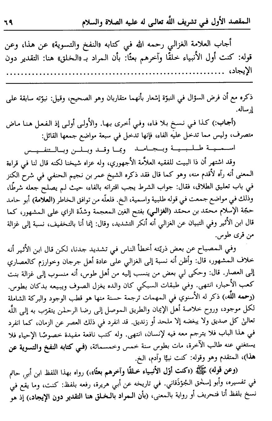 وفي المصباح عن بعض ذريته أخطأ الناس في تشديد جدنا، لكن قال ابن الأثير أنه خلاف المشهور، قال: وأظن أنه نسبة إلى الغزالي على عادة أهل جرجان وخوارزم كالعصاري إلى العصار. قال: وحكى لي بعض من ينسب إليه من أهل طوس، أنه منسوب إلى غزالة بنت كعب الأحبار، انتهى. وفي طبقات السبكي كان والده يغزل الصوف ويبيعه بدكان بطوس. "رحمه الله" ذكر له الأسنوي في المهمات ترجمة حسنة منها هو قطب الوجود والبركة الشاملة لكل موجود، وروح خلاصة أهل الإيمان والطريق الموصل إلى رضا الرحمن يتقرب به إلى الله تعالى كل صديق ولا يبغضه إلا ملحد أو زنديق. قد انفرد في ذلك العصر الزمان، كما انفرد في هذا الباب فلا يترجم معه فيه لإنسان، انتهى. وله كتب نافعة مفيدة خصوصًا الإحياء فلا يستغنى عنه طالب الآخرة، مات بطوس سنة خمس وخمسمائة. "في كتابه النفخ والتسوية عن هذا"، المتقدم وهو وقوله: كنت نبيًا وآدم ... إلخ.