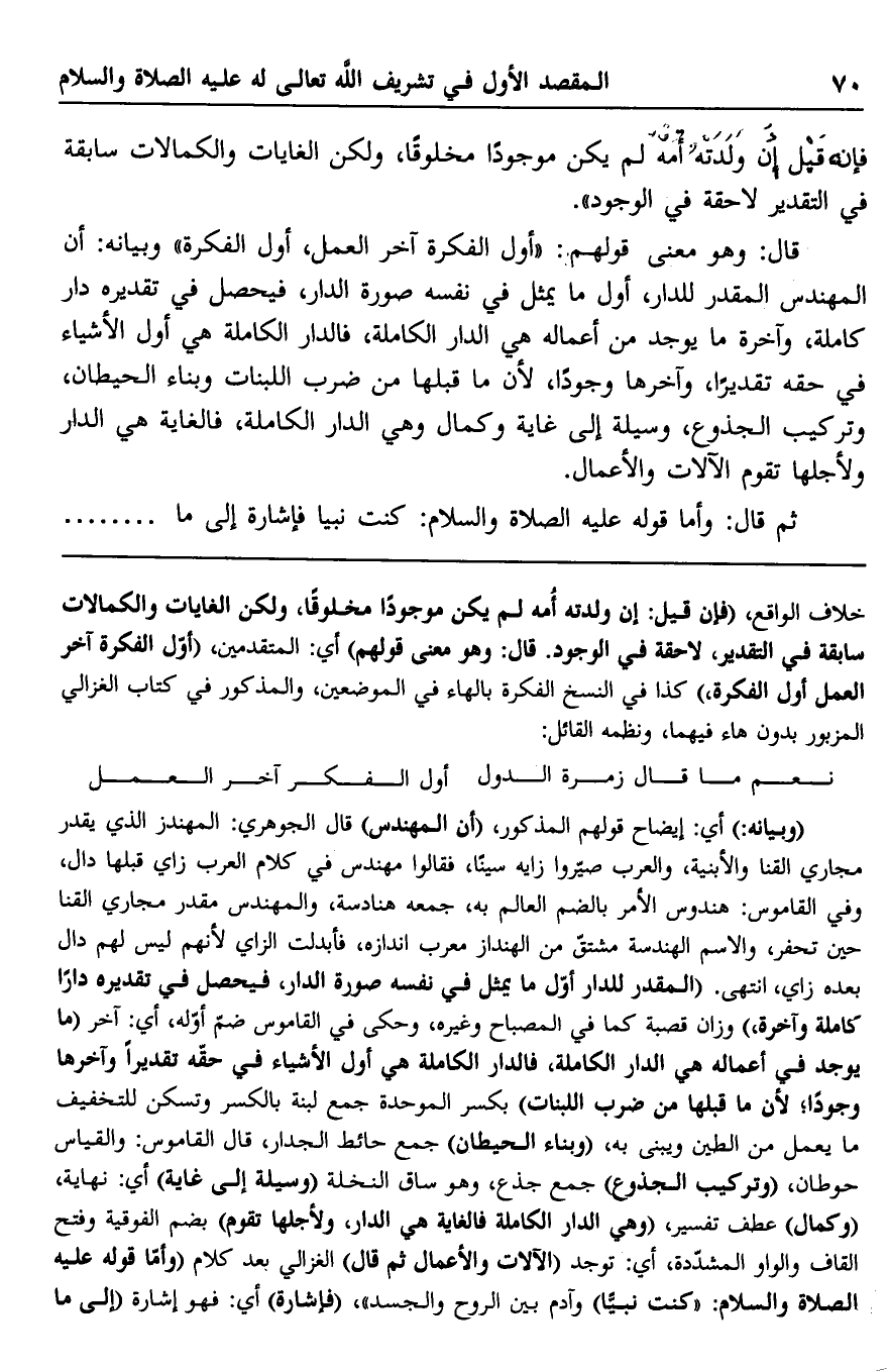 قال: وهو معنى قولهم: "أول الفكرة آخر العمل، أول الفكرة" وبيانه: أن المهندس المقدر للدار، أول ما يمثل في نفسه صورة الدار، فيحصل في تقديره دار كاملة، وآخرة ما يوجد من أعماله هي الدار الكاملة، فالدار الكاملة هي أول الأشياء في حقه تقديرًا، وآخرها وجودًا، لأن ما قبلها من ضرب اللبنات وبناء الحيطان، وتركيب الجذوع، وسيلة إلى غاية وكمال وهي الدار الكاملة، فالغاية هي الدار ولأجلها تقوم الآلات والأعمال.