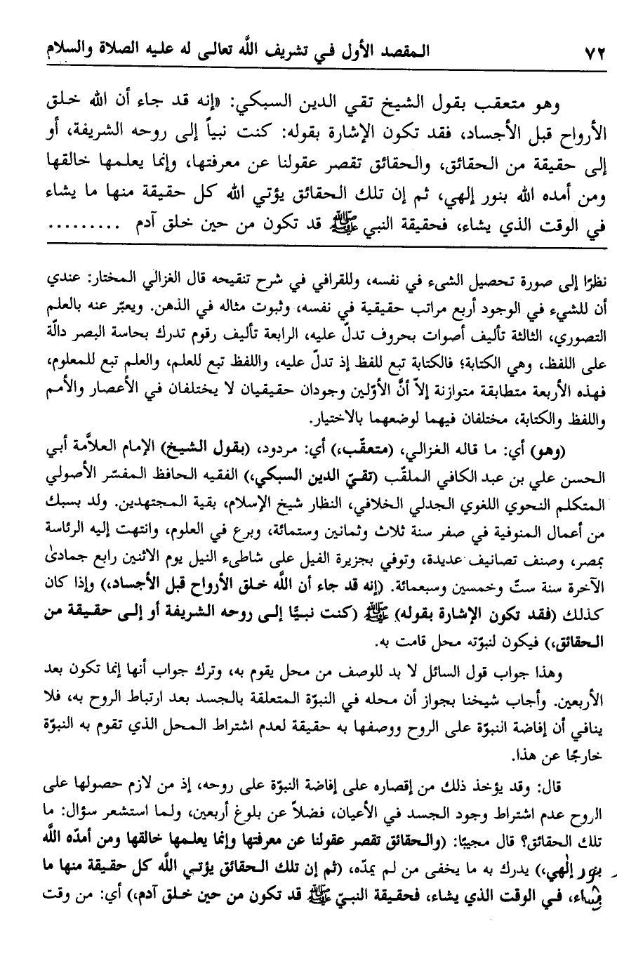 وهو متعقب بقول الشيخ تقي الدين السبكي: "إنه قد جاء أن الله خلق الأرواح قبل الأجساد، فقد تكون الإشارة بقوله: كنت نبيًا إلى روحه الشريفة، أو إلى حقيقة من الحقائق، والحقائق تقصر عقولنا عن معرفتها، وإنما يعلمها خالقها ومن أمده الله بنور إلهي، ثم إن تلك الحقائق يؤتي الله كل حقيقة منها ما يشاء في الوقت الذي يشاء، فحقيقة النبي صلى الله عليه وسلم قد تكون من حين خلق آدم..................