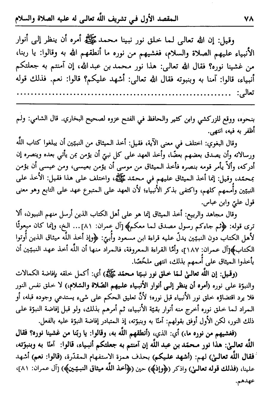 "وقيل: إن الله تعالى لما خلق نور نبينا محمد صلى الله عليه وسلم" أي: أكمل خلقه بإفاضة الكمالات والنبوة على نوره "أمره أن ينظر إلى أنوار الأنبياء عليهم الصلاة والسلام" لا خلق نفس النور فلا يرد اقتضاؤه خلق نور الأنبياء قبل نوره؛ لأن تعليق الحكم على شيء يستدعي وجوده قبله، أو المراد لما خلق نوره أخرج منه أنوار بقية الأنبياء، ثم أمرهم بذلك، ولو قبل إفاضة النبوة على ذلك النور، لكن الأول أوفق بقولهم: آمنا به وبنبوته، إذ المتبادر إفاضة النبوة عليه بالفعل.