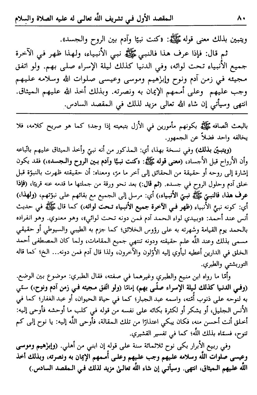 ثم قال: فإذا عرف هذا فالنبي صلى الله عليه وسلم نبي الأنبياء، ولهذا ظهر في الآخرة جميع الأنبياء تحت لوائه، وفي الدنيا كذلك ليلة الإسراء صلى بهم. ولو اتفق مجيئه في زمن آدم ونوح وإبراهيم وموسى وعيسى صلوات الله وسلامه عليهم وجب عليهم وعلى أممهم الإيمان به ونصرته. وبذلك أخذ الله عليهم الميثاق. انتهى وسيأتي إن شاء الله تعالى لذلك في المقصد السادس.