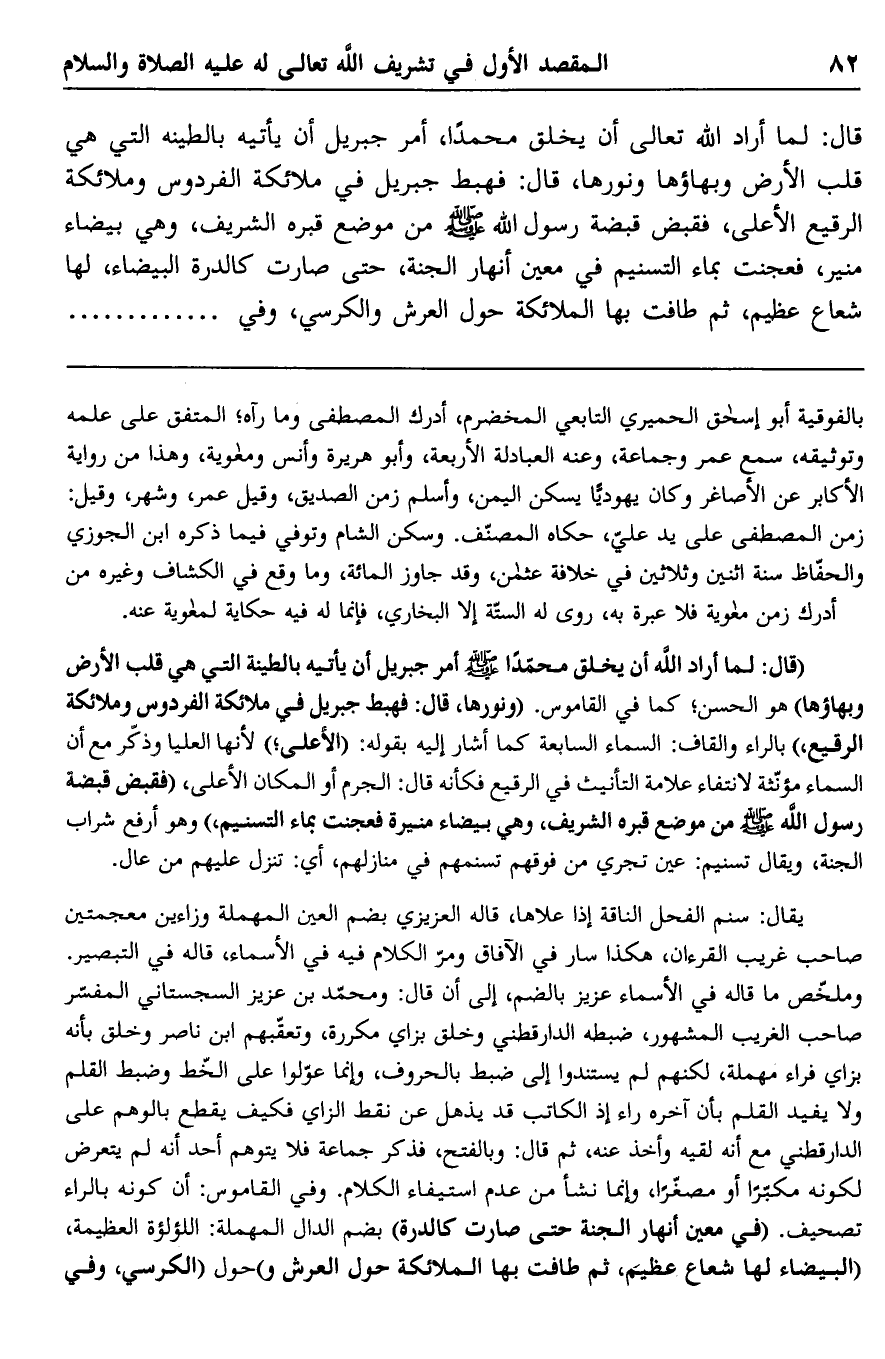 قال: لما أراد الله تعالى أن يخلق محمدًا، أمر جبريل أن يأتيه بالطينه التي هي قلب الأرض وبهاؤها ونورها، قال: فهبط جبريل في ملائكة الفردوس وملائكة الرقيع الأعلى، فقبض قبضة رسول الله صلى الله عليه وسلم من موضع قبره الشريف، وهي بيضاء منير، فعجنت بماء التسنيم في معين أنهار الجنة، حتى صارت كالدرة البيضاء لها شعاع عظيم، ثم طافت بها الملائكة حول العرش والكرسي، وفي.......................
