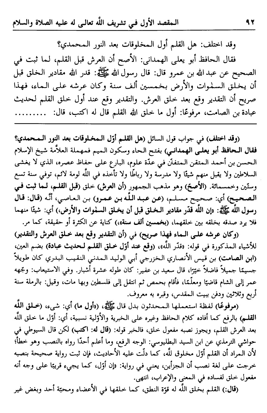 "وقد اختلف" في جواب قول السائل "هل القلم أول المخلوقات بعد النور المحمدي؟ فقال الحافظ أبو يعلى الهمداني" بفتح الحاء وسكون الميم فمهملة العلامة شيخ الإسلام الحسن بن أحمد المتقن المتفنن في عدة علوم، البارع على حفاظ عصره، الذي لا يغشى السلاطين ولا يقبل منهم شيئًا ولا مدرسة ولا رباطًا ولا تأخذه في الله لومة لائم، توفي سنة تسع وستين وخمسمائة. "الأصح" وهو مذهب الجمهور "أن العرش" خلق "قبل القلم، لما ثبت في الصحيح" أي: صحيح مسلم، "عن عبد الله بن عمرو" بن العاصي، أنه "قال: قال رسول الله صلى الله عليه وسلم: "إن الله قدر مقادير الخلق قبل أن يخلق السماوات والأرض" أي: شيئًا منهما فلا يرد صدقه بخلقه بين خلقهما، "بخمسين ألف سنة" كناية عن الكثرة أو حقيقة، كما مر.