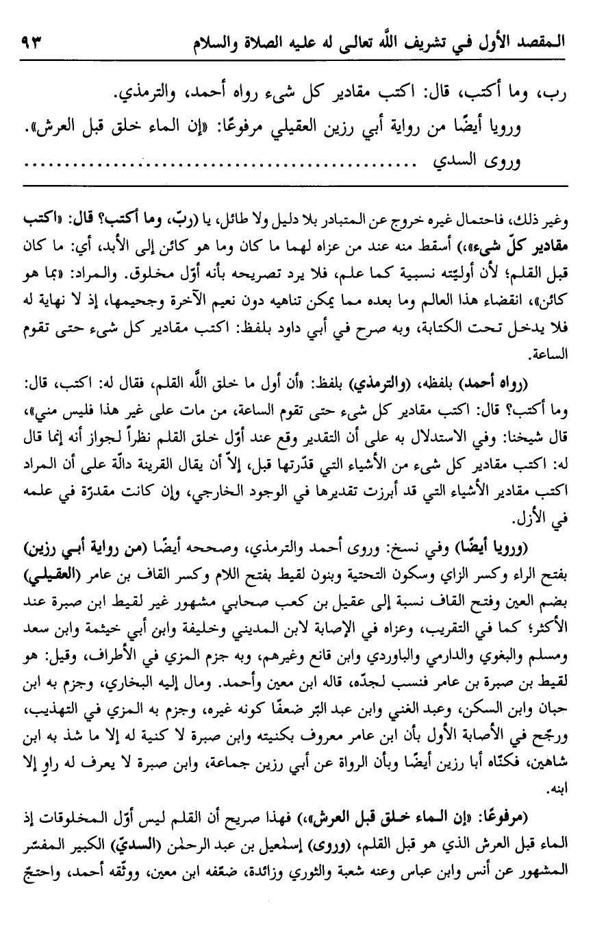 "مرفوعًا: إن الماء خلق قبل العرش" فهذا صريح أن القلم ليس أول المخلوقات إذ الماء قبل العرش الذي هو قبل القلم، "وروى" إسماعيل بن عبد الرحمن "السدي" الكبير المفسر المشهور عن أنس وابن عباس وعنه شعبة والثوري وزائدة، ضعفه ابن معين، ووثقه أحمد، واحتج