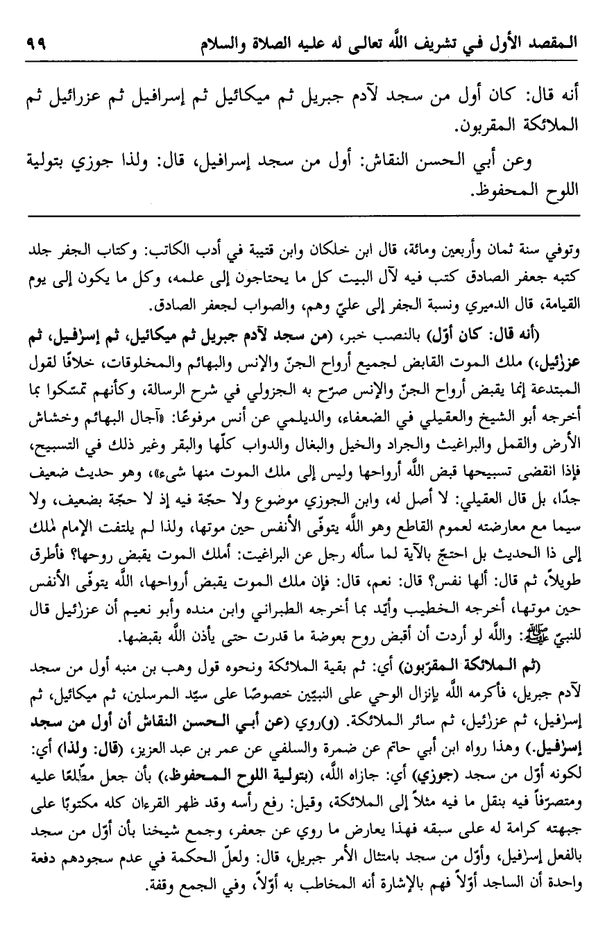وعن أبي الحسن النقاش: أول من سجد إسرافيل، قال: ولذا جوزي بتولية اللوح المحفوظ.