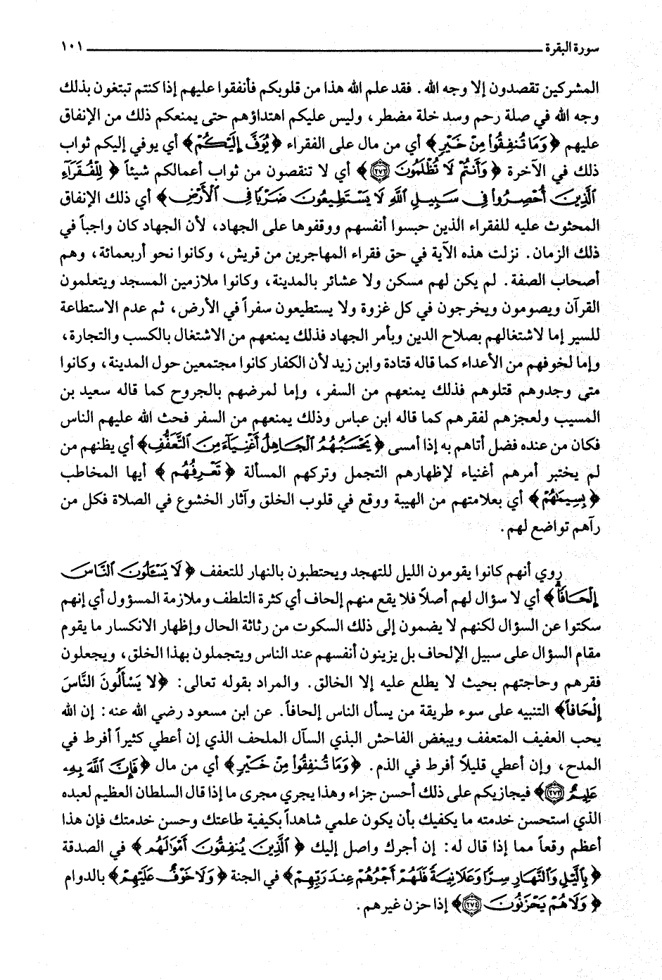 روي أنهم كانوا يقومون الليل للتهجد ويحتطبون بالنهار للتعفف لا يَسْئَلُونَ النَّاسَ إِلْحافاً أي لا سؤال لهم أصلا فلا يقع منهم إلحاف أي كثرة التلطف وملازمة المسؤول أي إنهم سكتوا عن السؤال لكنهم لا يضمون إلى ذلك السكوت من رثاثة الحال وإظهار الانكسار ما يقوم مقام السؤال على سبيل الإلحاف بل يزينون أنفسهم عند الناس ويتجملون بهذا الخلق، ويجعلون فقرهم وحاجتهم بحيث لا يطلع عليه إلا الخالق. والمراد بقوله تعالى: لا يَسْئَلُونَ النَّاسَ إِلْحافاً التنبيه على سوء طريقة من يسأل الناس إلحافا. عن ابن مسعود رضي الله عنه: إن الله يحب العفيف المتعفف ويبغض الفاحش البذي السآل الملحف الذي إن أعطي كثيرا أفرط في المدح، وإن أعطي قليلا أفرط في الذم. وَما تُنْفِقُوا مِنْ خَيْرٍ أي من مال فَإِنَّ اللَّهَ بِهِ عَلِيمٌ (273) فيجازيكم على ذلك أحسن جزاء وهذا يجري مجرى ما إذا قال السلطان العظيم لعبده الذي استحسن خدمته ما يكفيك بأن يكون علمي شاهدا بكيفية طاعتك وحسن خدمتك فإن هذا أعظم وقعا مما إذا قال له: إن أجرك واصل إليك الَّذِينَ يُنْفِقُونَ أَمْوالَهُمْ في الصدقة بِاللَّيْلِ وَالنَّهارِ سِرًّا وَعَلانِيَةً فَلَهُمْ أَجْرُهُمْ عِنْدَ رَبِّهِمْ في الجنة وَلا خَوْفٌ عَلَيْهِمْ بالدوام وَلا هُمْ يَحْزَنُونَ (274) إذا حزن غيرهم.
