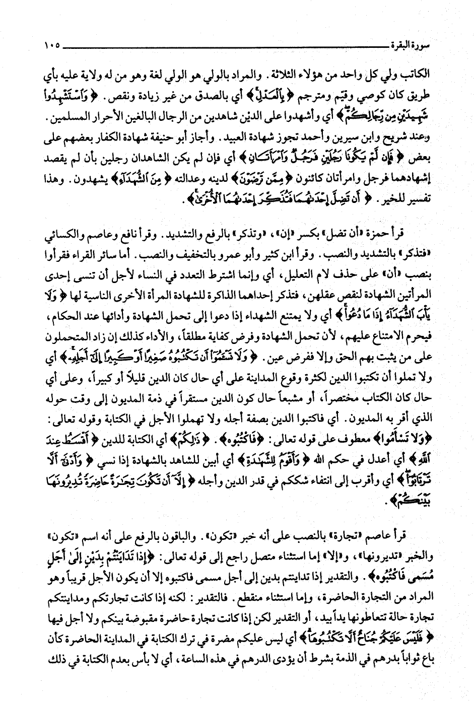 قرأ حمزة «أن تضل» بكسر «إن» ، «وتذكر» بالرفع والتشديد. وقرأ نافع وعاصم والكسائي «فتذكر» بالتشديد والنصب. وقرأ ابن كثير وأبو عمرو بالتخفيف والنصب. أما سائر القراء فقرأوا بنصب «أن» على حذف لام التعليل، أي وإنما اشترط التعدد في النساء لأجل أن تنسى إحدى المرأتين الشهادة لنقص عقلهن، فتذكر إحداهما الذاكرة للشهادة المرأة الأخرى الناسية لها وَلا يَأْبَ الشُّهَداءُ إِذا ما دُعُوا أي ولا يمتنع الشهداء إذا دعوا إلى تحمل الشهادة وأدائها عند الحكام، فيحرم الامتناع عليهم، لأن تحمل الشهادة وفرض كفاية مطلقا، والأداء كذلك إن زاد المتحملون على من يثبت بهم الحق وإلا ففرض عين. وَلا تَسْئَمُوا أَنْ تَكْتُبُوهُ صَغِيراً أَوْ كَبِيراً إِلى أَجَلِهِ أي ولا تملوا أن تكتبوا الدين لكثرة وقوع المداينة على أي حال كان الدين قليلا أو كبيرا، وعلى أي حال كان الكتاب مختصرا، أو مشبعا حال كون الدين مستقرا في ذمة المديون إلى وقت حوله الذي أقر به المديون. أي فاكتبوا الدين بصفة أجله ولا تهملوا الأجل في الكتابة وقوله تعالى: